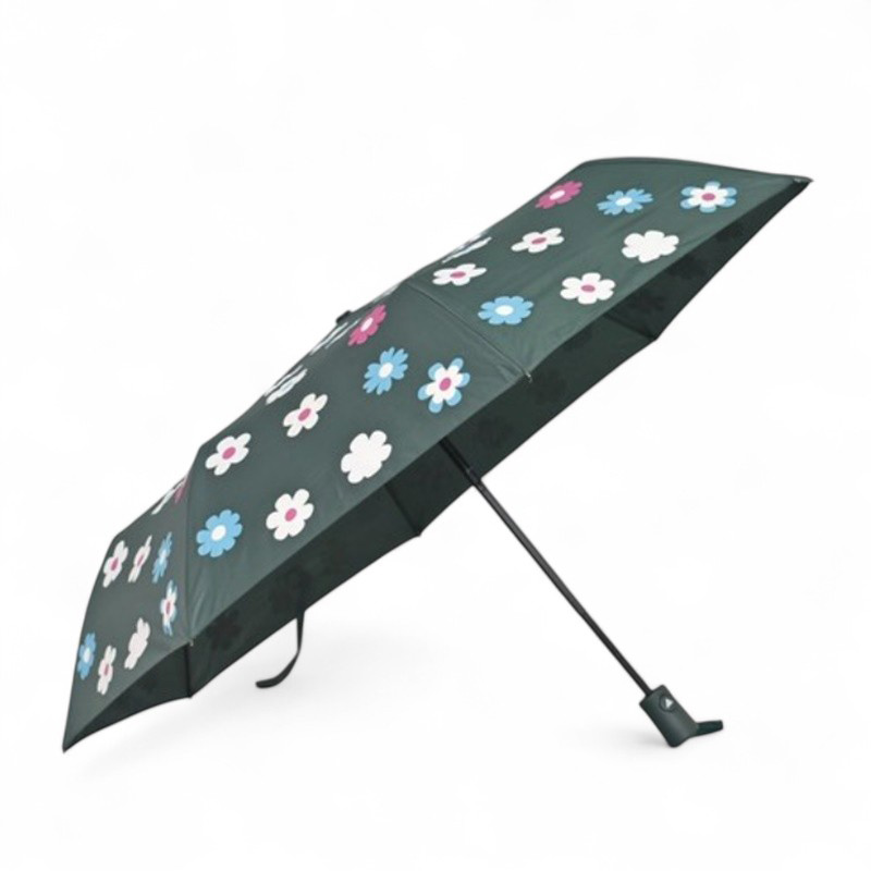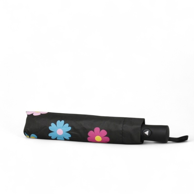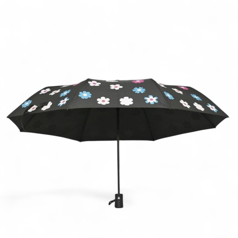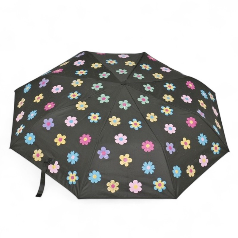Дамски чадър със здрава рамка с 8 спици, еднопосочен автомат, с удобна дръжка с връзка и калъф. Чадърът е ветроустойчив, бързосъхнещ. Белите цветя променят цвета си при намокряне.