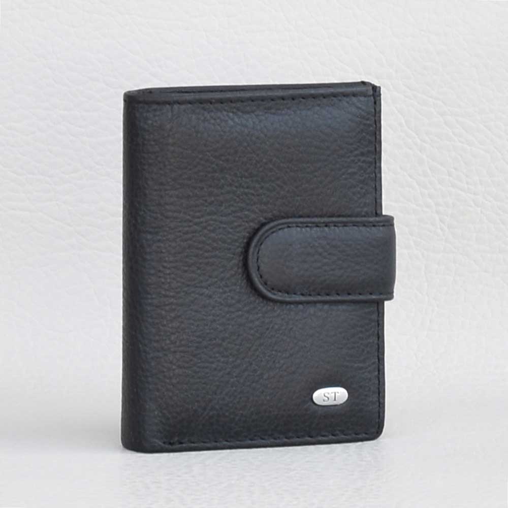 Калъф от естествена кожа за лични документи и карти с 12 листа, вертикален, с отделение за банкноти, затваряне с тик-так копче. Цвят: черен. Калъфът ще получите в кутия, подходяща за подарък.