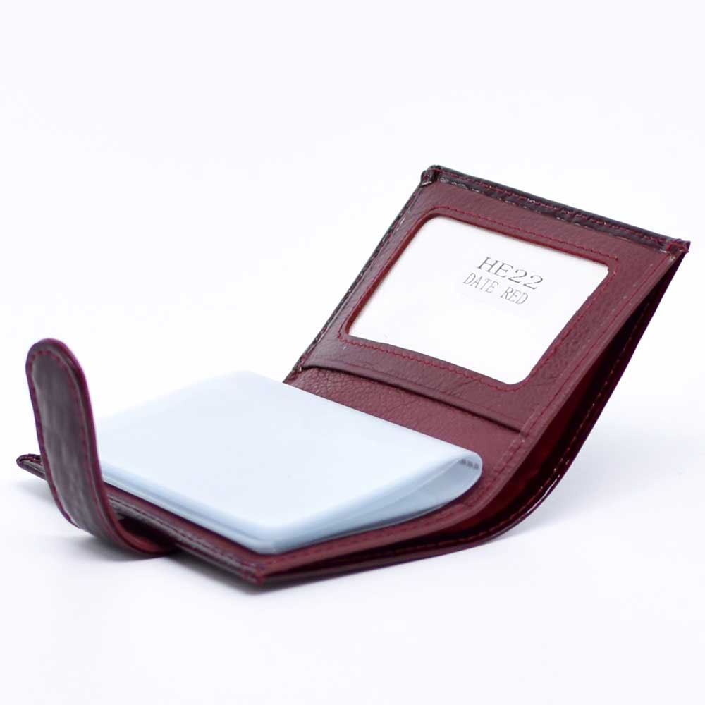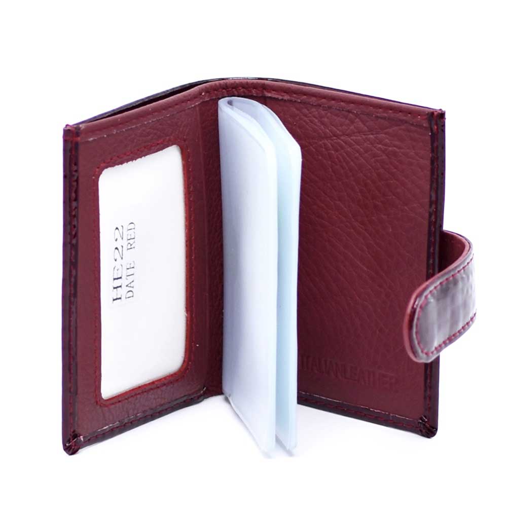 Калъф от естествена кожа за лични документи и карти с 12 листа, вертикален, с отделение за банкноти, затваряне с тик-так копче. Цвят: бордо. Калъфът ще получите в кутия, подходяща за подарък.