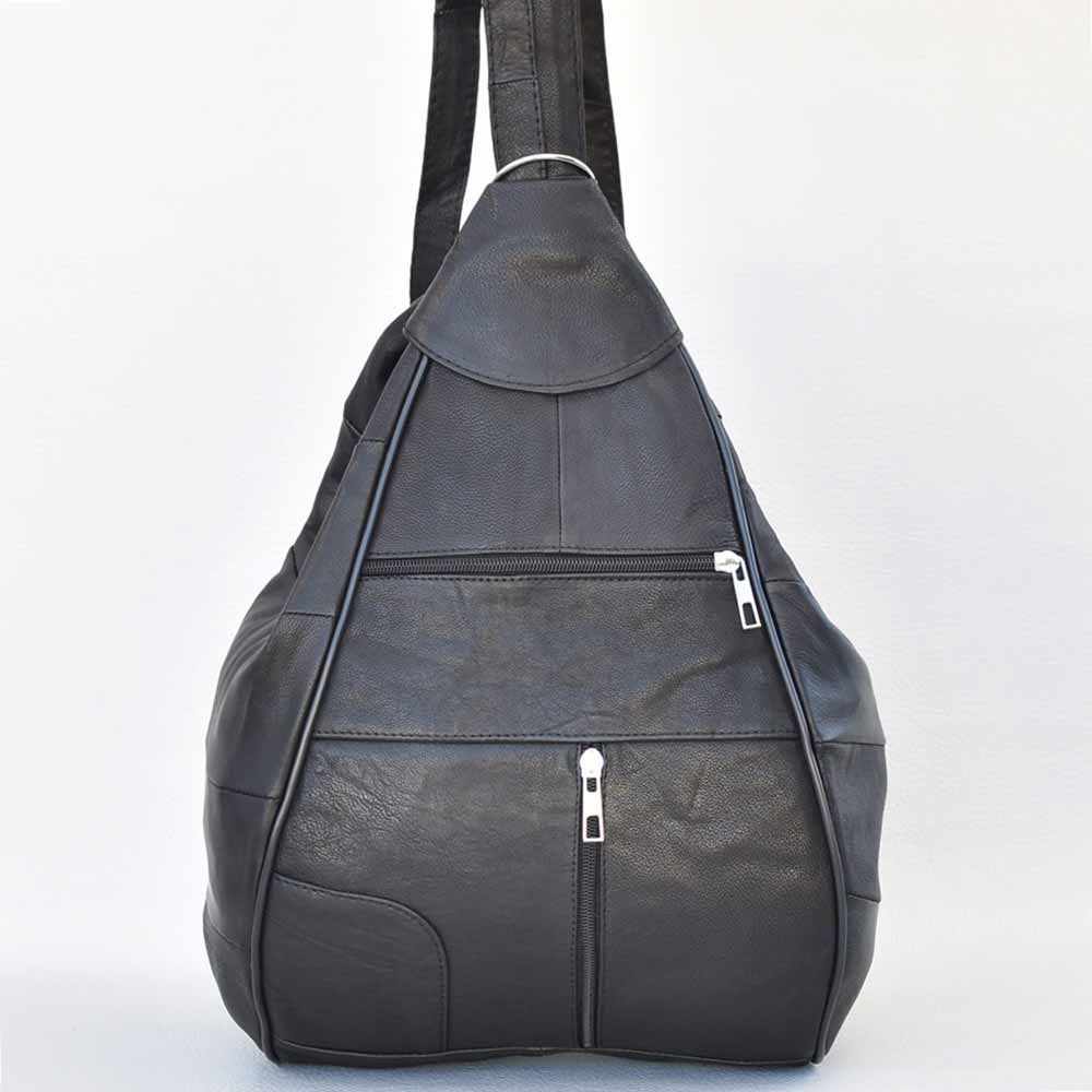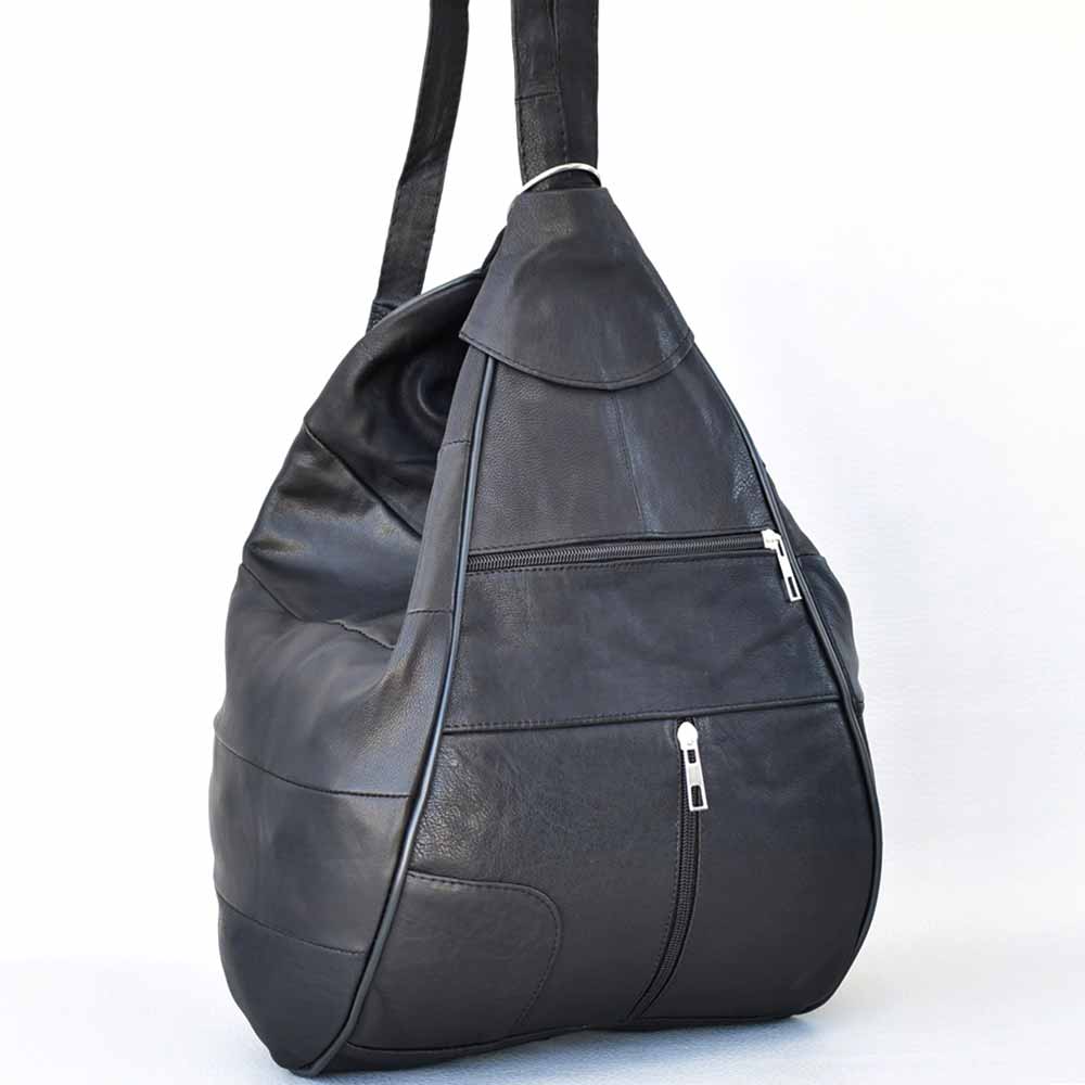 Спортно-елегантна дамска раница-чанта от естествена кожа с два предни и един заден джоб, затварящи се с цип.