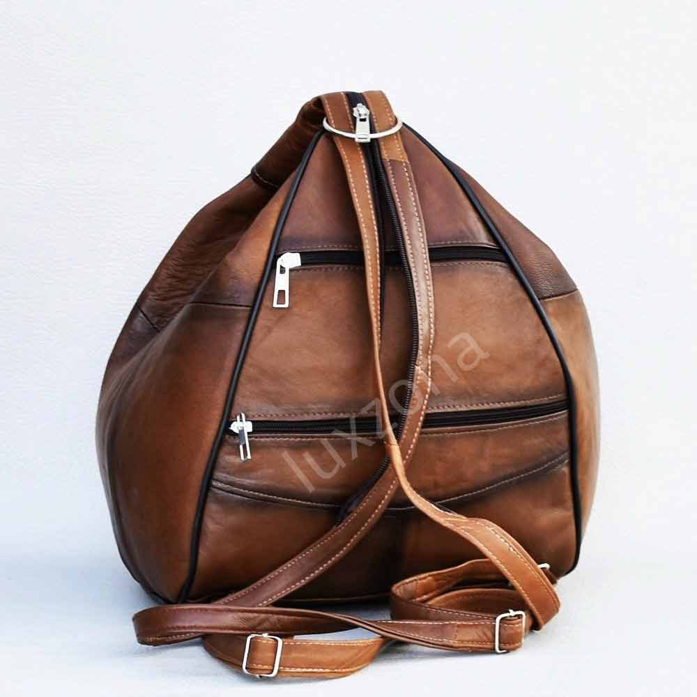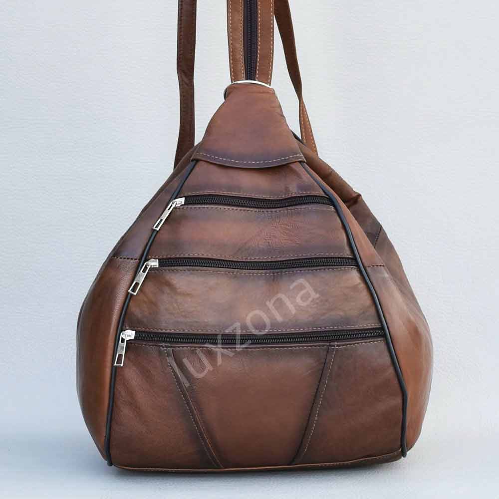 Спортно-елегантна дамска раница-чанта от естествена кожа с три предни и два задни джоба, затварящи се с цип, вътрешен джоб с цип.
