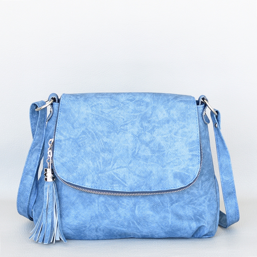 Българска дамска чанта за през рамо малка с капак и пискюл синя Код J2000255