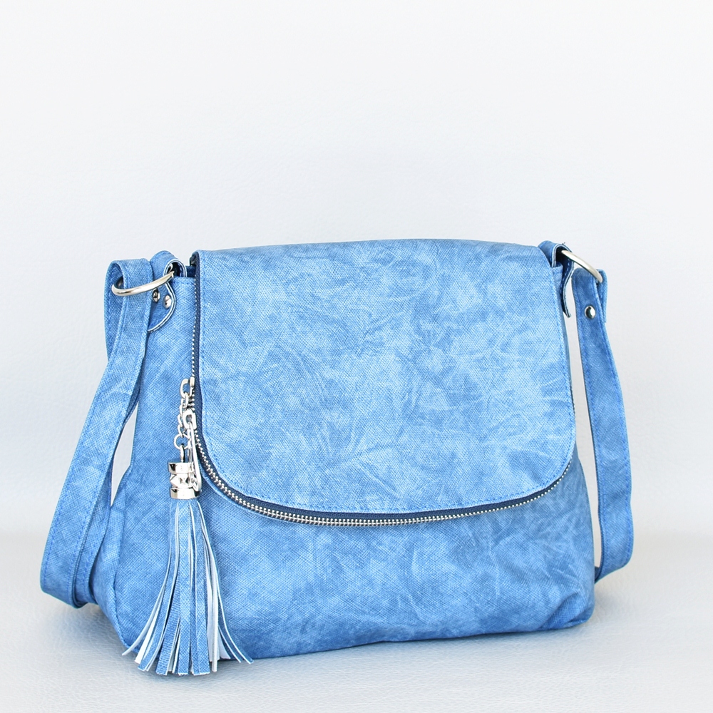 Българска дамска чанта за през рамо малка с капак и пискюл синя