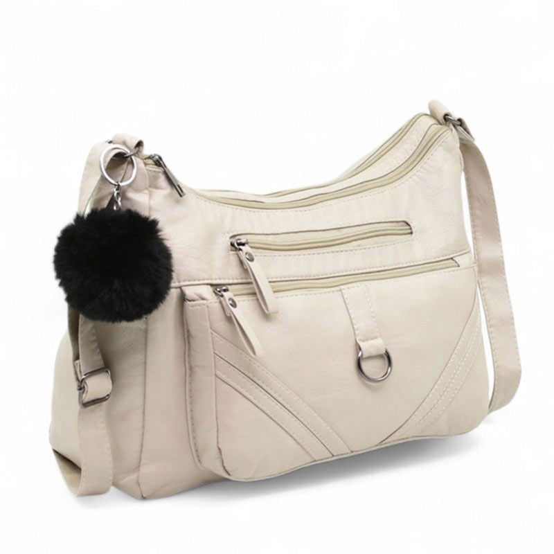 Всекидневна дамска чанта от мека варена кожа с много външни джобчета, две отделения, едното с вътрешен джоб с цип, две странични джобчета. Подарък висулка - цвят на късмет.