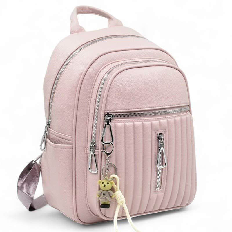 Дамска раница от еко кожа с ефектна висулка изчистен модел розова