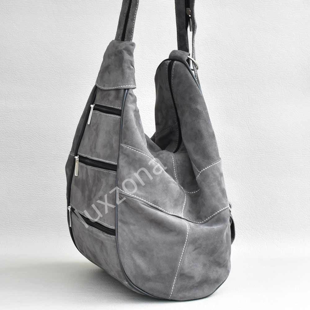 Дамска раница-чанта от естествена кожа велур с външни джобчета, сива Код H402026
