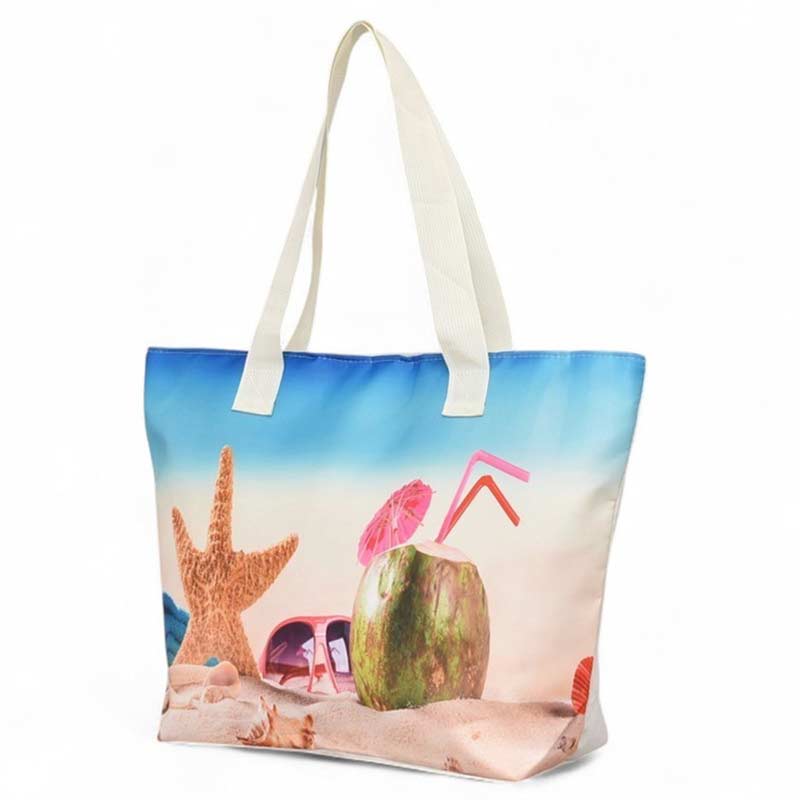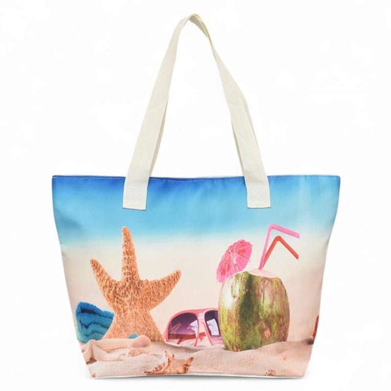 Практична плажна чанта от плат, затваряне с цип по цялата дължина, текстилен хастар вътрешен джоб с цип. Чантата за плаж е с удобни дръжки за носене в ръка или на рамо.