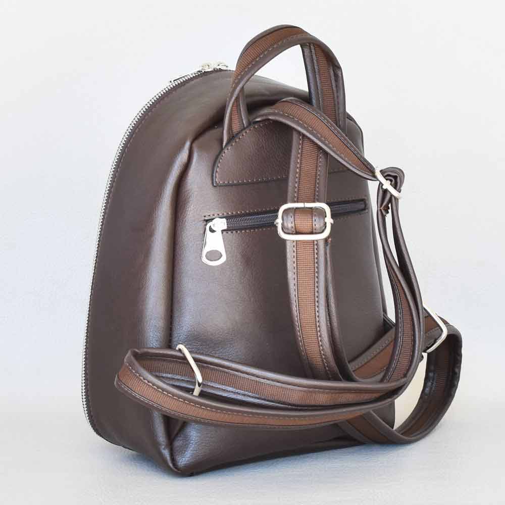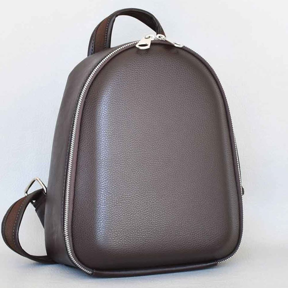 Дамска кожена раница от еко кожа, твърда, с едно основно отделение, вътрешен джоб с цип, заден джоб с цип, цвят-кафяв.