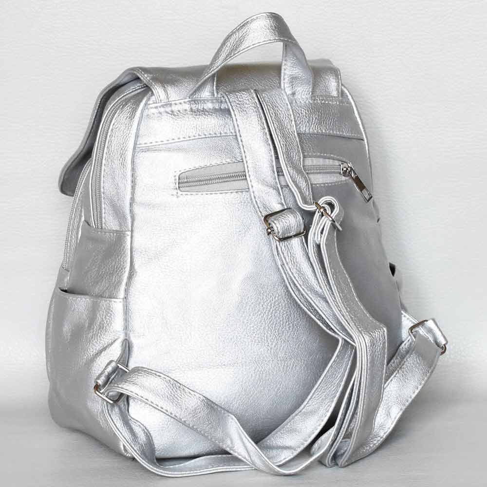 Кожена дамска раница с капак, едно голямо отделение с вътрешен джоб с цип и два джоба за телефон, преден и заден джоб с цип, цвят-сребърна.