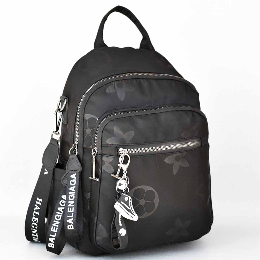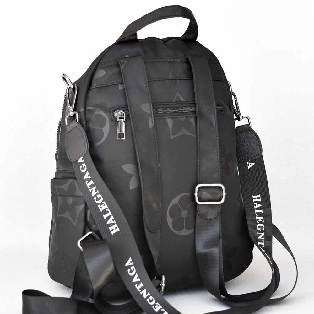 Елегантна дамска раница-чанта от промазан водонепропусклив плат с удобно вътрешно разпределение. Раницата е с два предни и един заден джоб с цип, две странични джобчета. Дамската раница е с къса дръжка за носене в ръка, регулиращи се презрамки и дълга дръжка за през рамо.