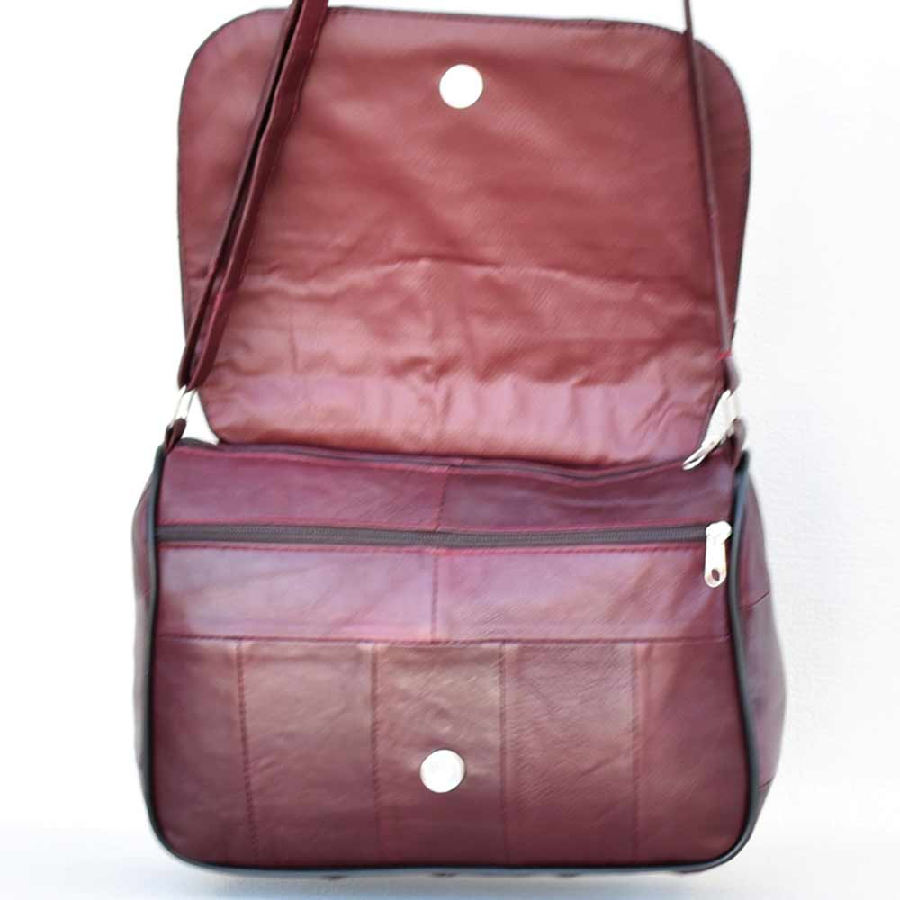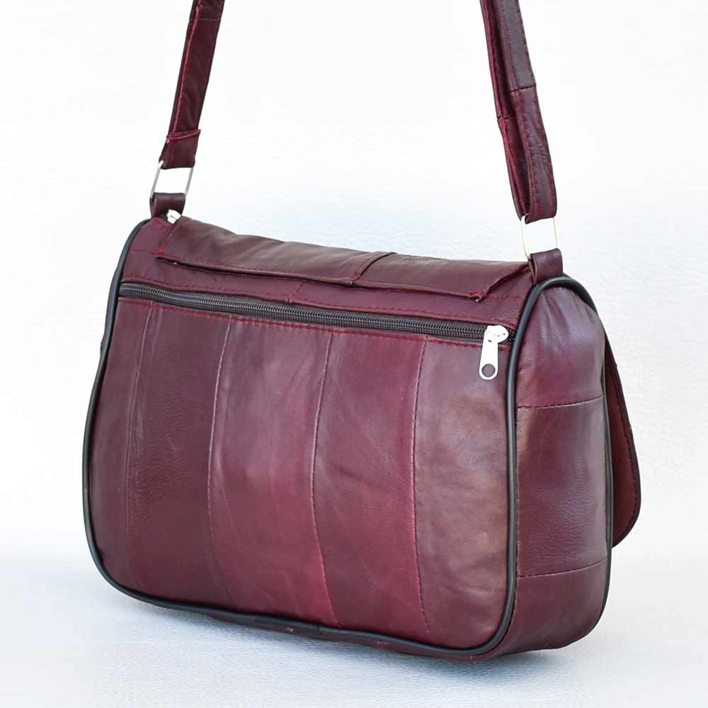 Дамска чанта от естествена кожа на парчета с дълга регулираща се дръжка за през рамо, с капак, едно основно отделение затварящо се с цип и вътрешен джоб, преден и заден джоб с цип.