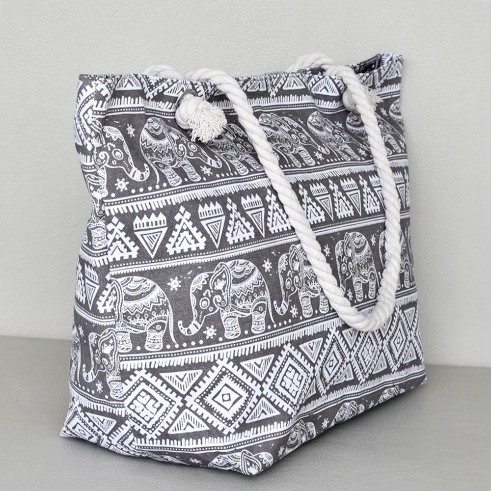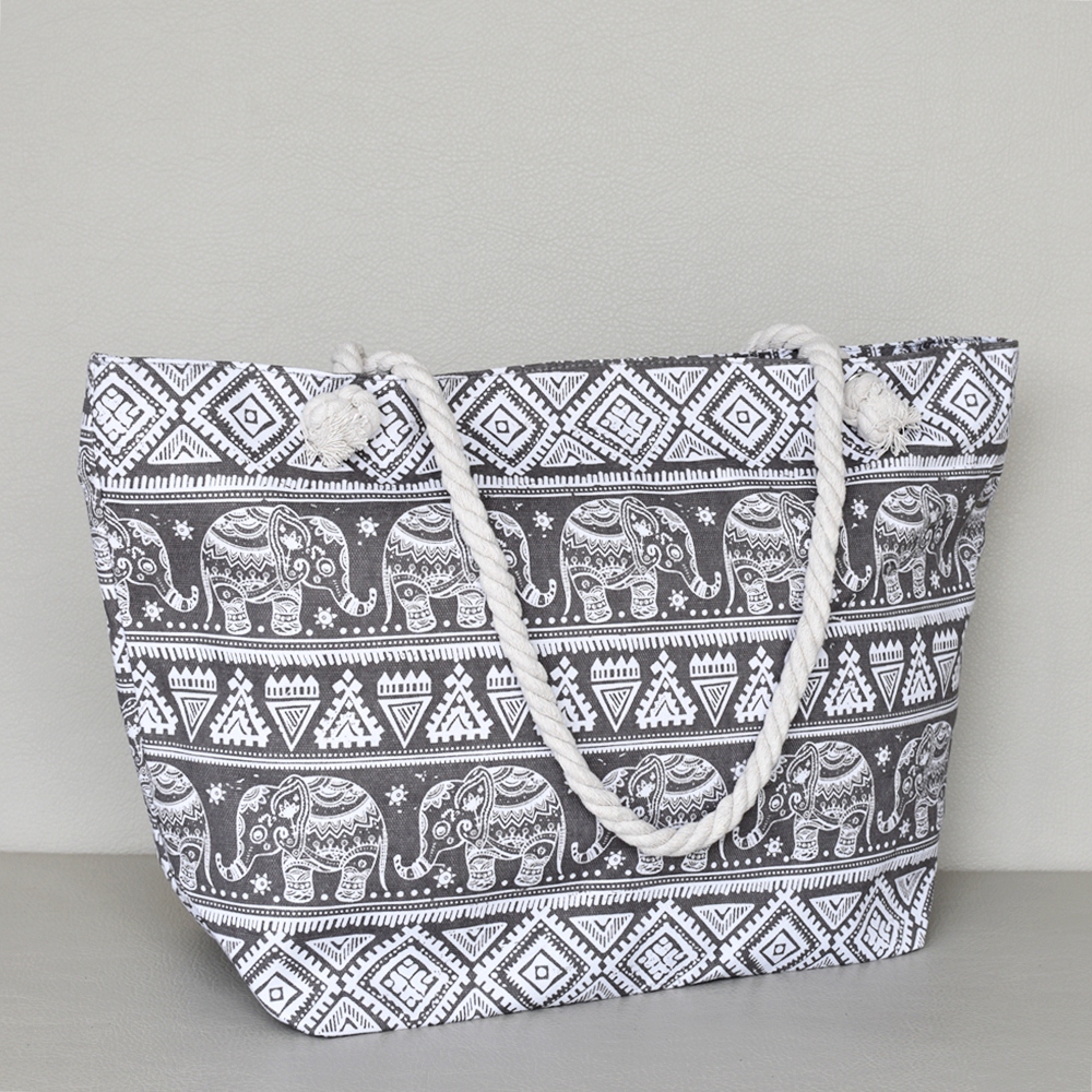 Голяма плажна чанта текстилна сива с етно мотиви затваряне с цип лято 2018