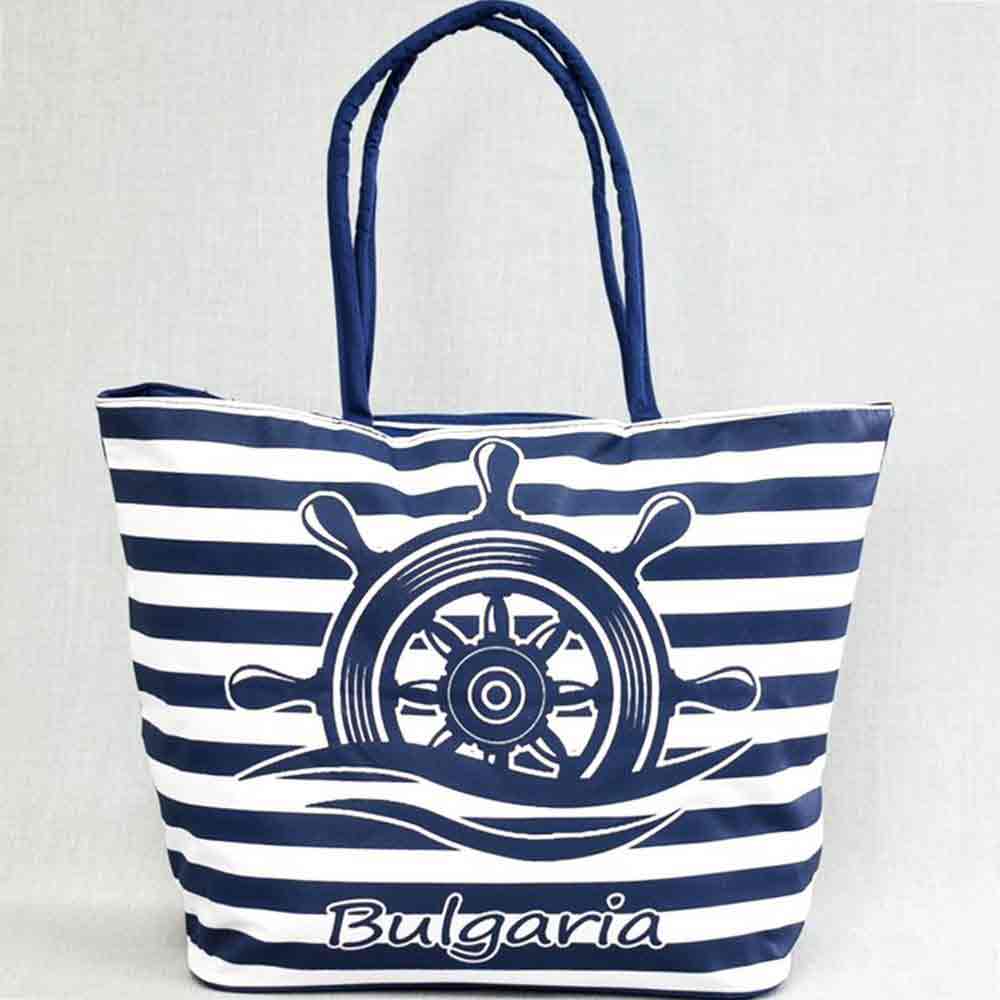 Плажна чанта България, евтина, от непромокаем плат, затваряне с цип, синьо-бели райета