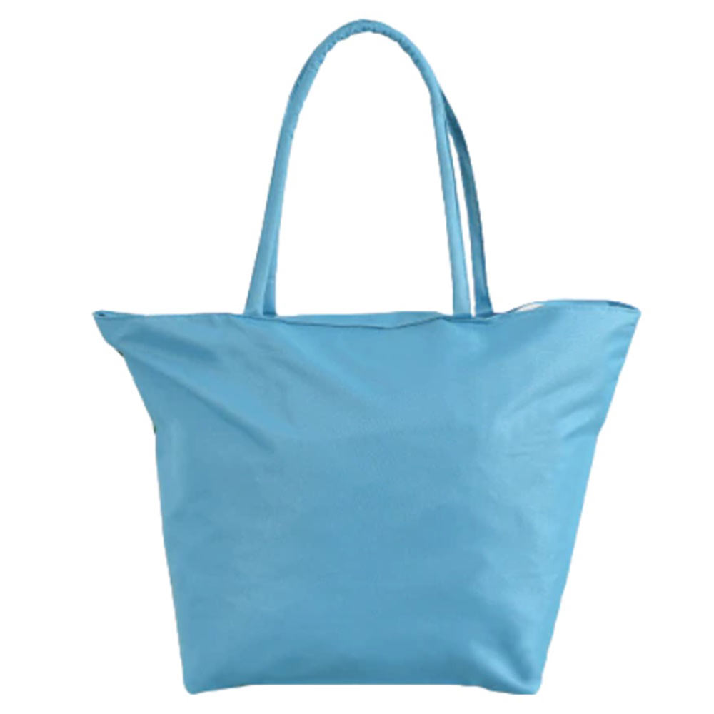 Голяма и удобна плажна чанта от непромокаем плат, затваряне с цип по цялата дължина, вътрешен джоб с цип, с удобни дръжки за носене в ръка или на рамо, без хастар. Цветът на гърба е като цвета на дръжките.
