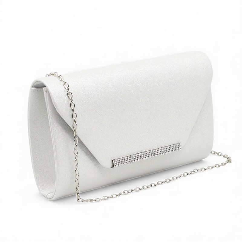 Клъч официална дамска чанта капак с лайсна с блестящи камъчета стилен модел бялаКлъч официална дамска чанта капак с лайсна с блестящи камъчета стилен модел бяла