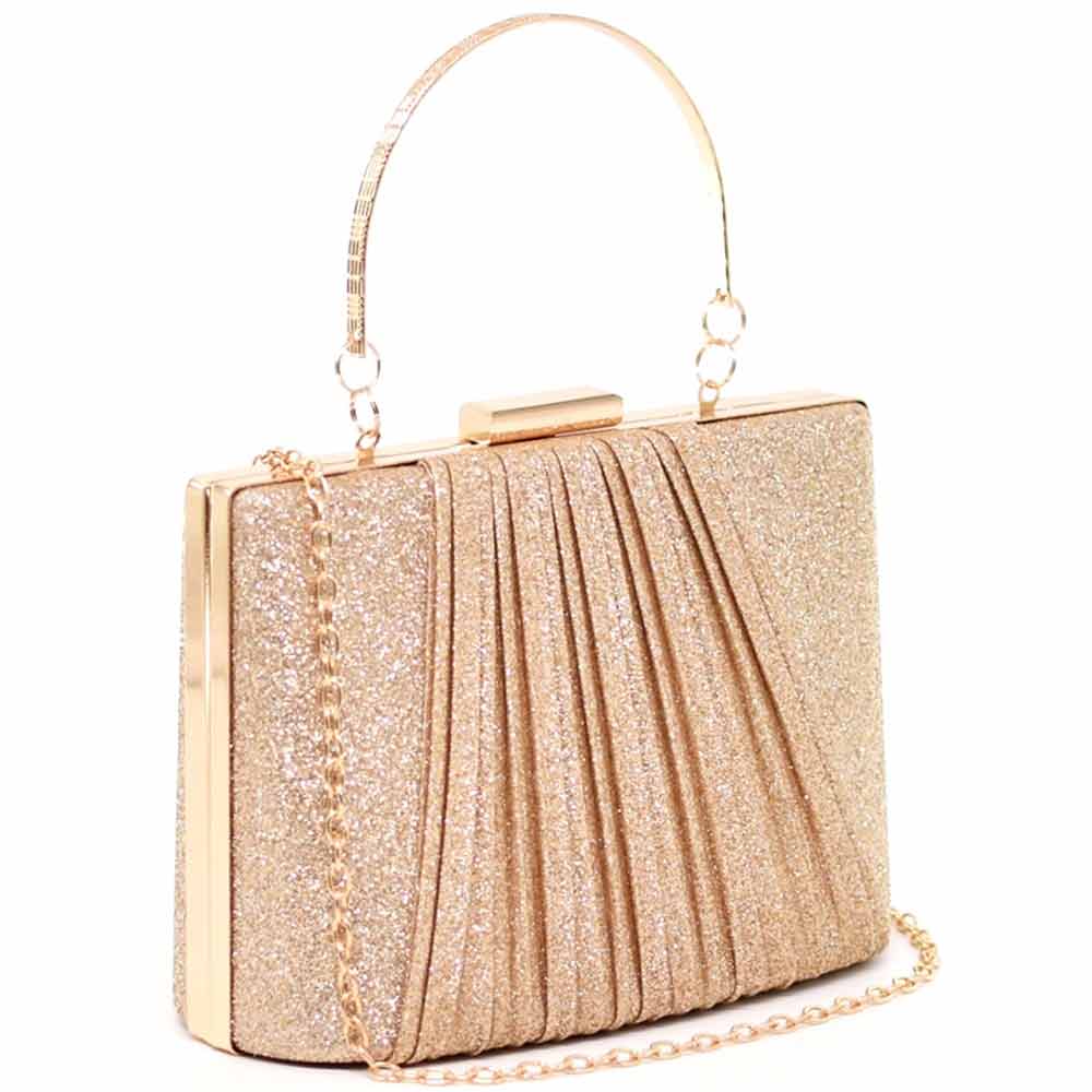Блестяща бална чанта с брокат, златна, къса и сваляща се дълга дръжка тип синджирче.