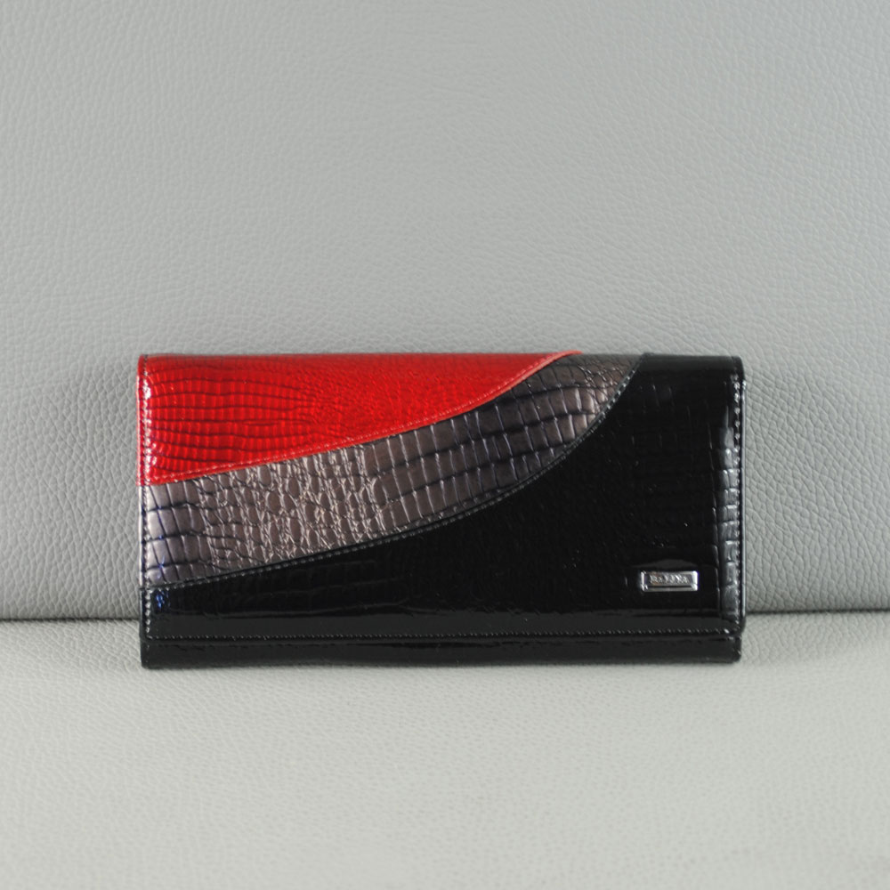 Дамско портмоне от естествена кожа лачено черно, сиво и червено Код SH952