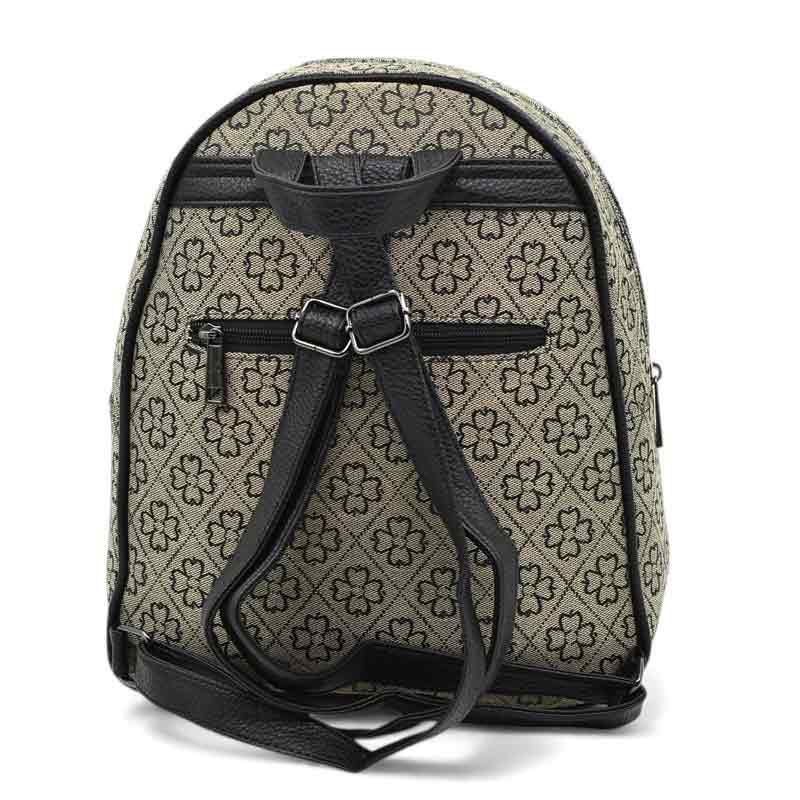 Дамска текстилна раница с едно основни отделение, два предни и един заден джоб с цип. Дамската раница има удобна дръжка за носене в ръка и регулиращи се кожени презрамки.