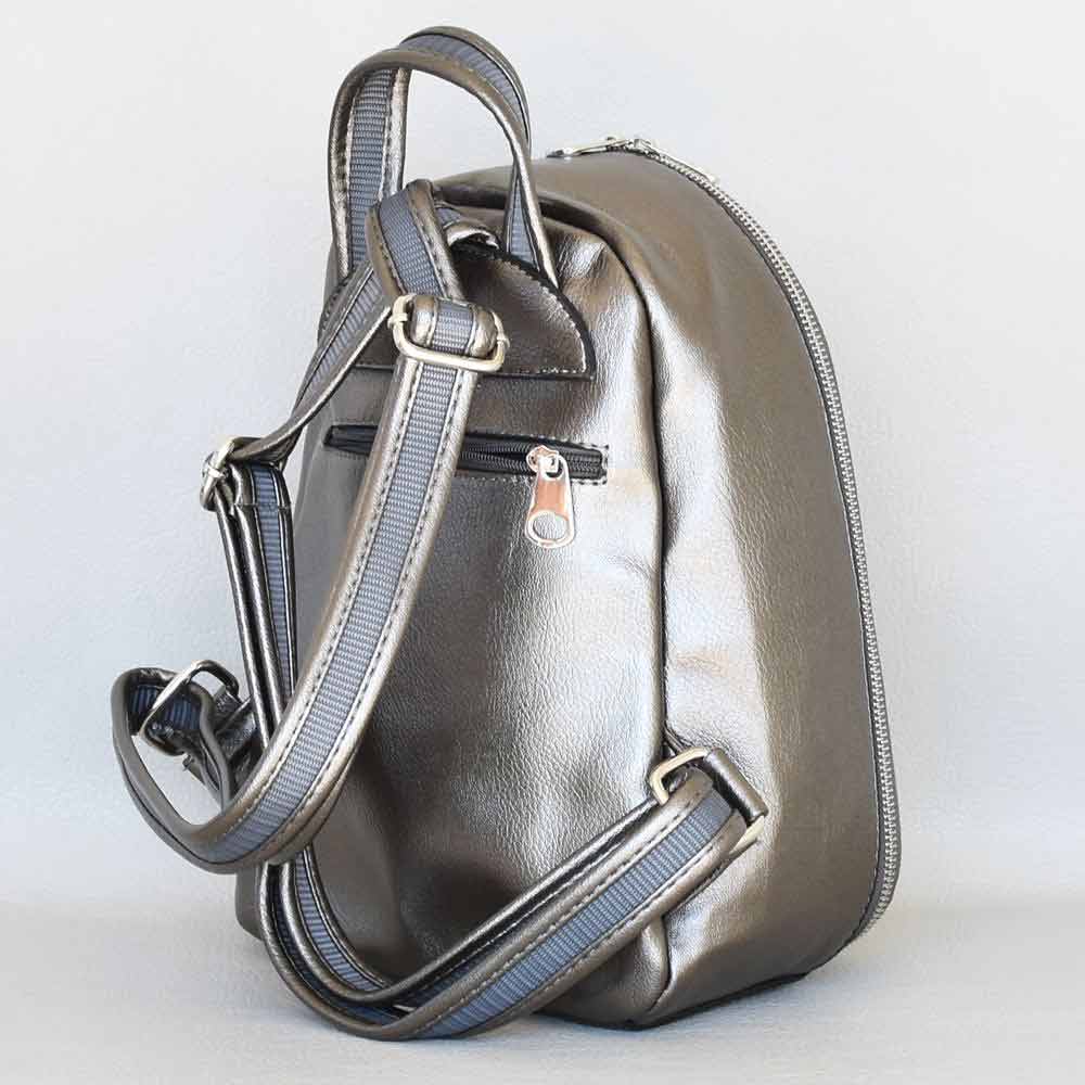 Дамска кожена раница от еко кожа, твърда, с едно основно отделение, вътрешен джоб с цип, заден джоб с цип, цвят-сребро.