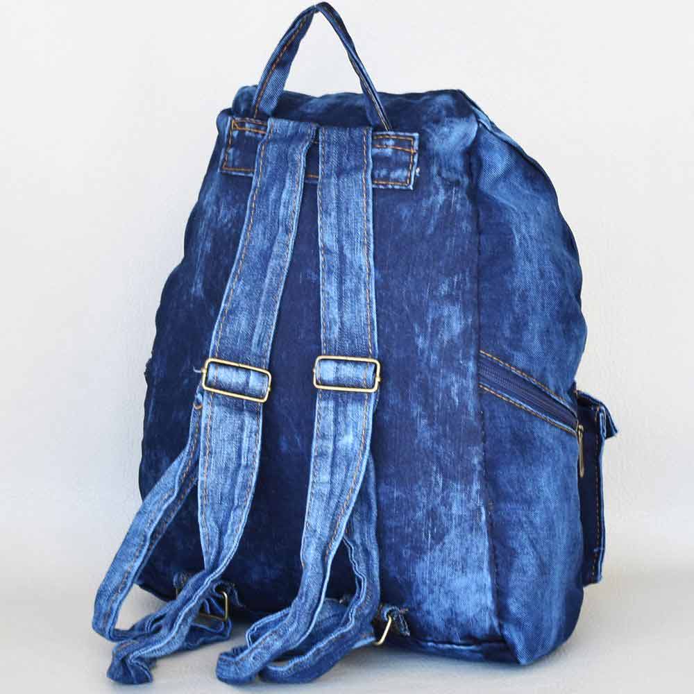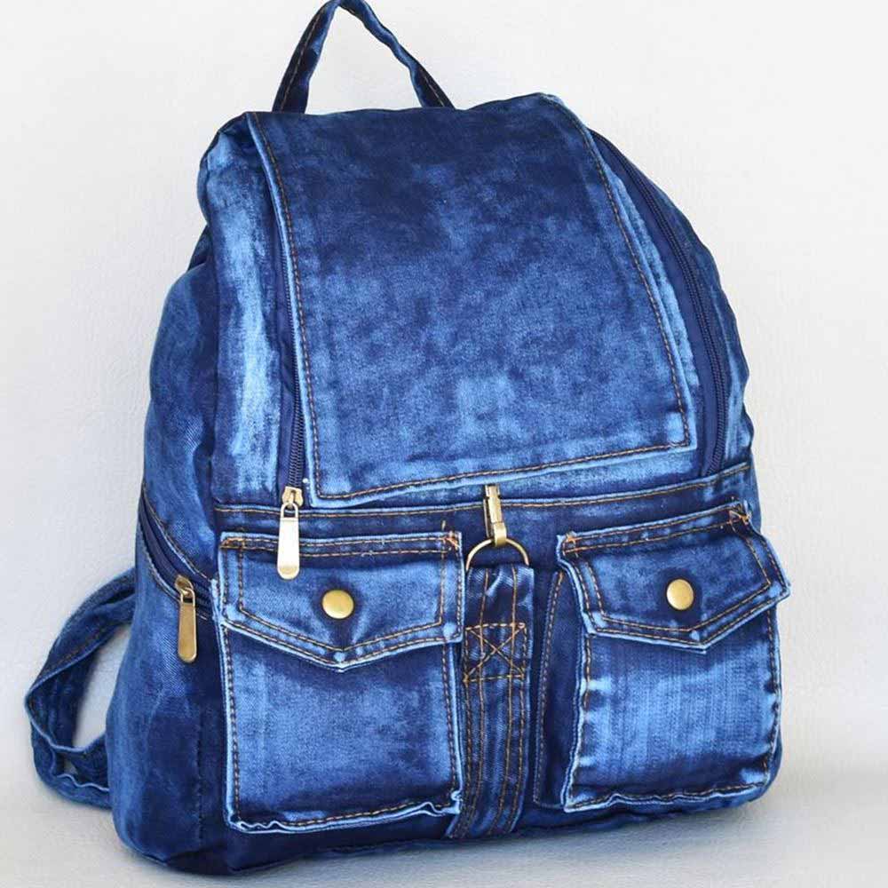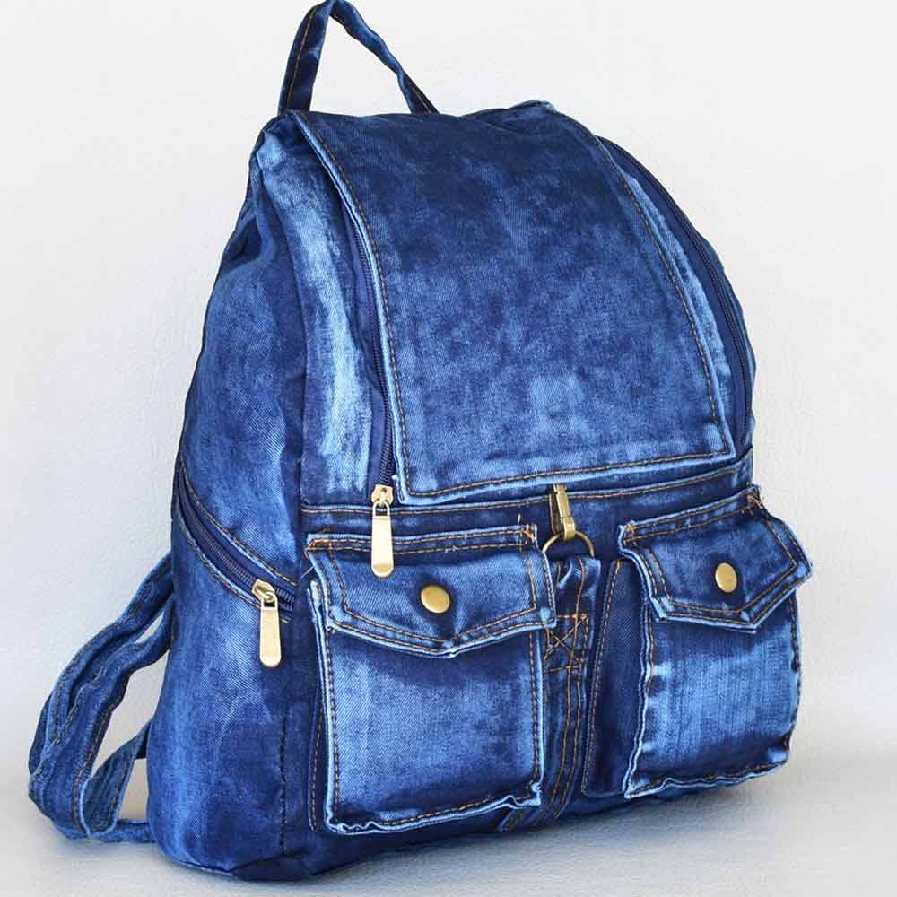 Дамска раница от дънков плат, с капак, два предни и два странични джоба.
