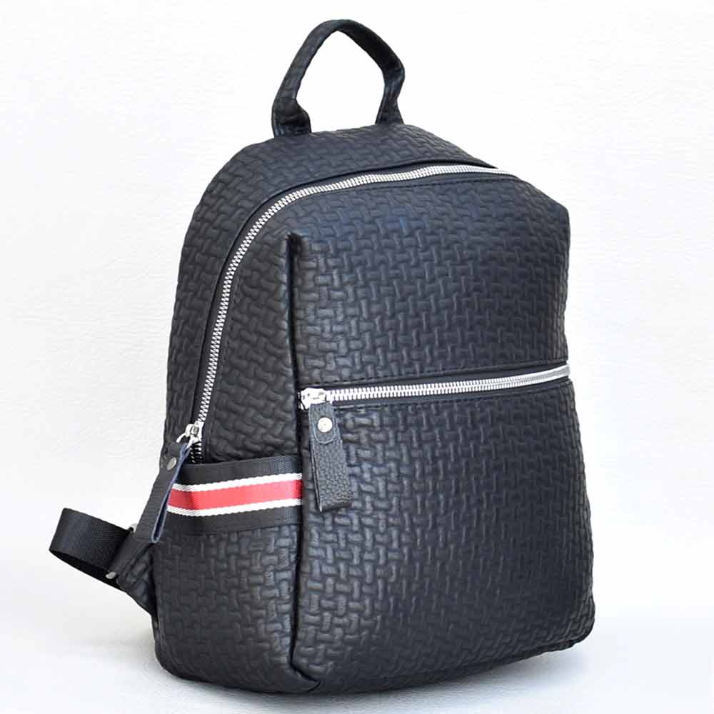 Ефектна дамска раница от релефна еко кожа с едно основно отделение с удобно вътрешно разпределение, преден и заден джоб с цип и две странични джобчета. Дамската раница е с регулиращи се презрамки и дръжка за носене в ръка.