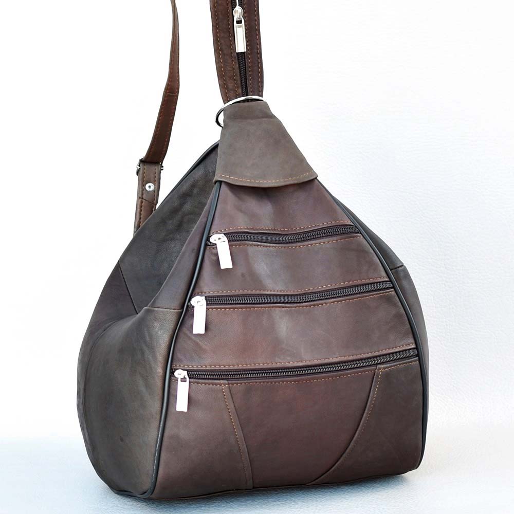 Спортно-елегантна дамска раница-чанта от естествена кожа с три предни и два задни джоба, затварящи се с цип, вътрешен джоб с цип.