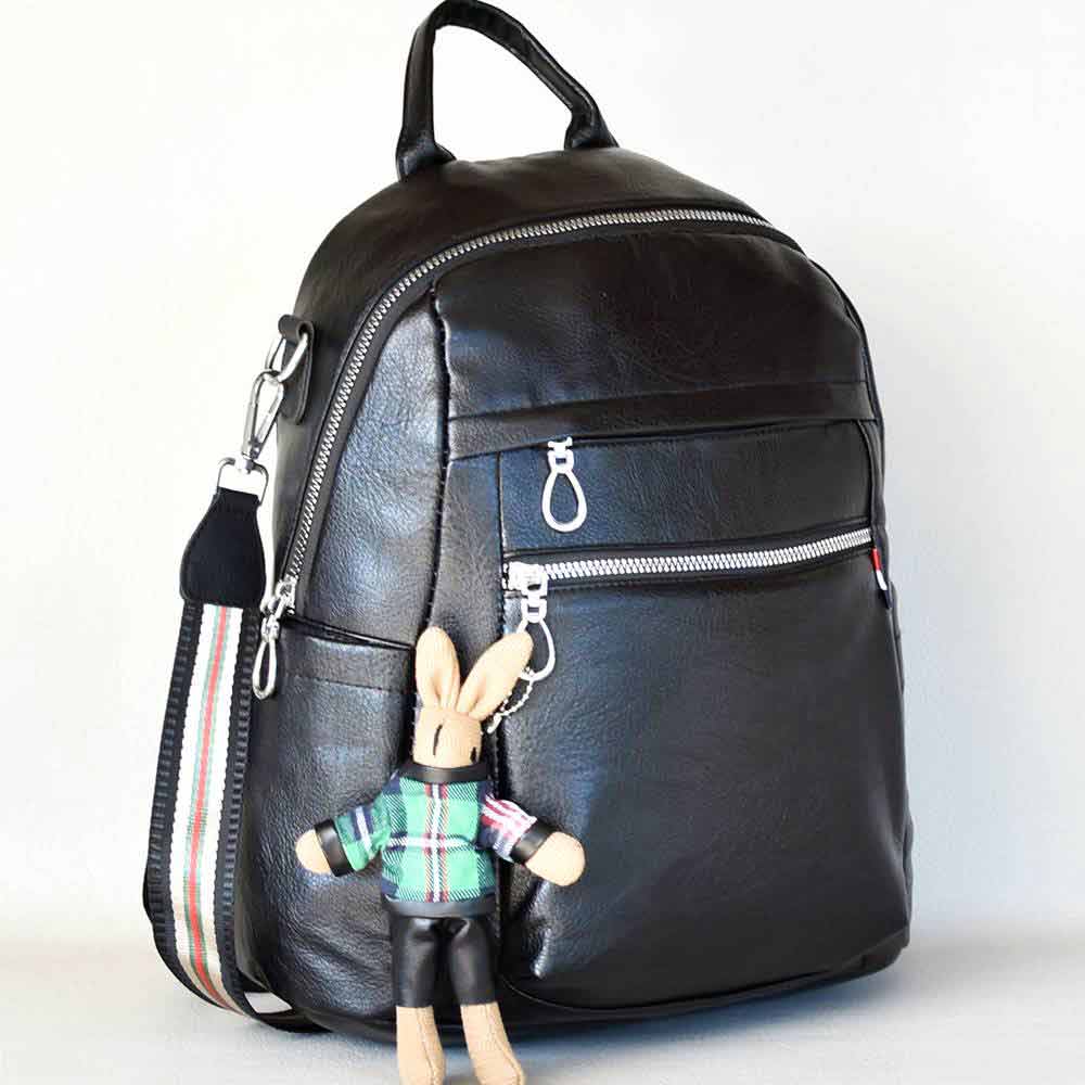 Дамска раница-чанта 2в1 от еко кожа с много джобчета и висулка Зайче, черна Код M1140-6-11