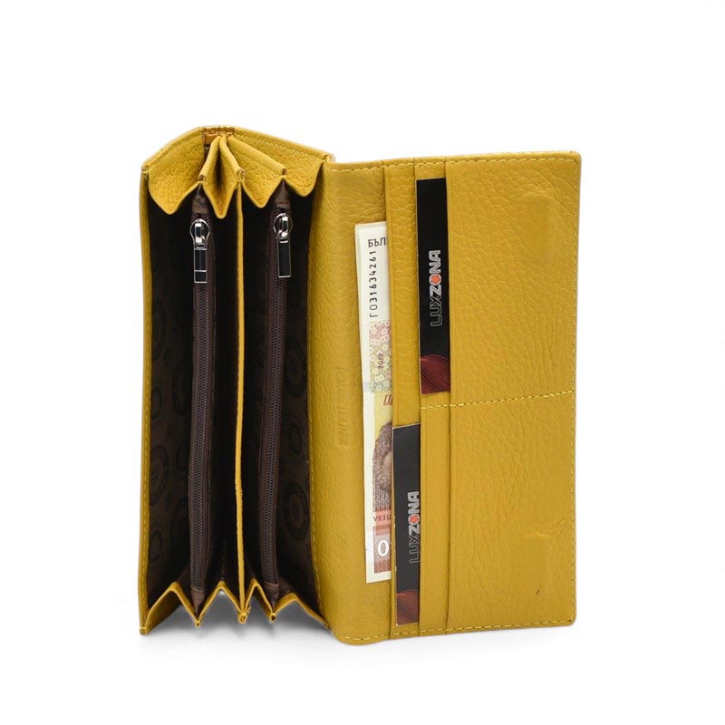 Дамски портфейл от естествена кожа с магнитно закопчаване, един външен и два вътрешни монетника, 4 отделения за банкноти, един голям джоб, 8 отделения за карти. Портмонето ще получите в кутия, подходяща за подарък.