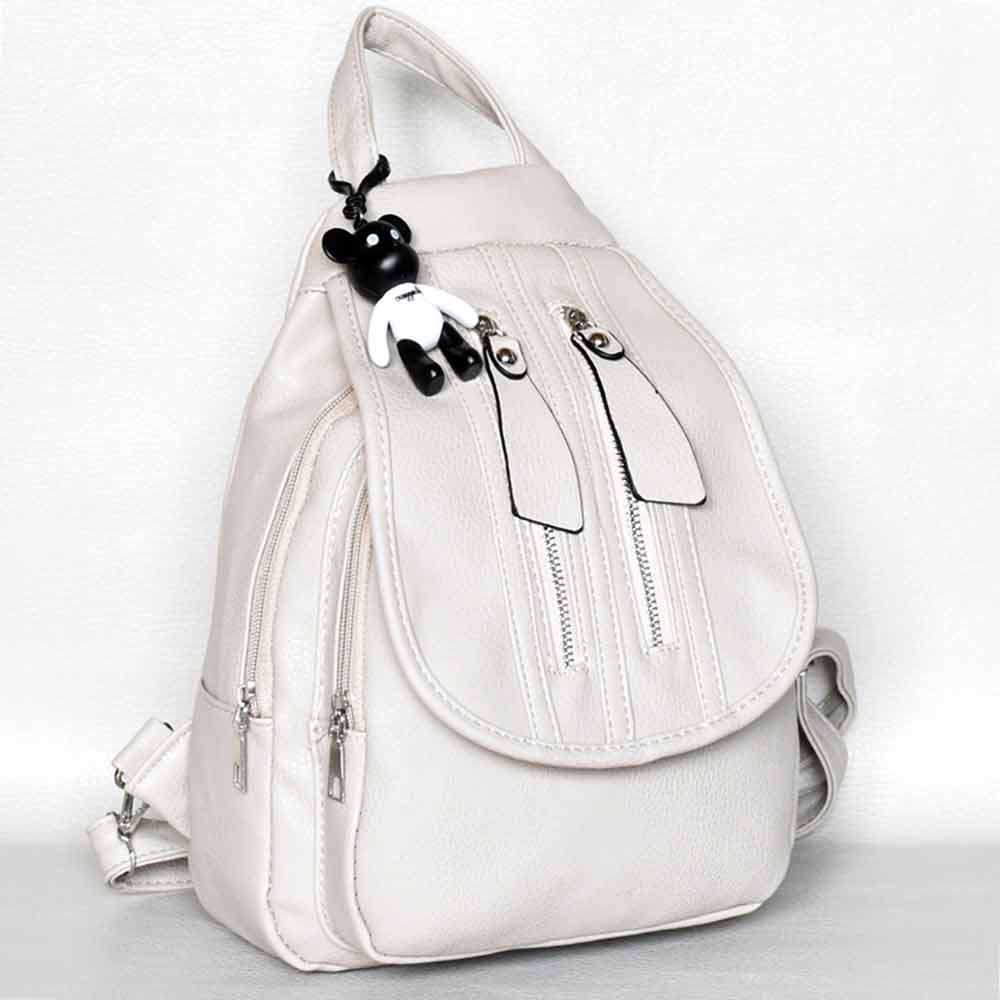 Дамска раница от еко кожа с капак  и висулка стилен модел сиво-бежова