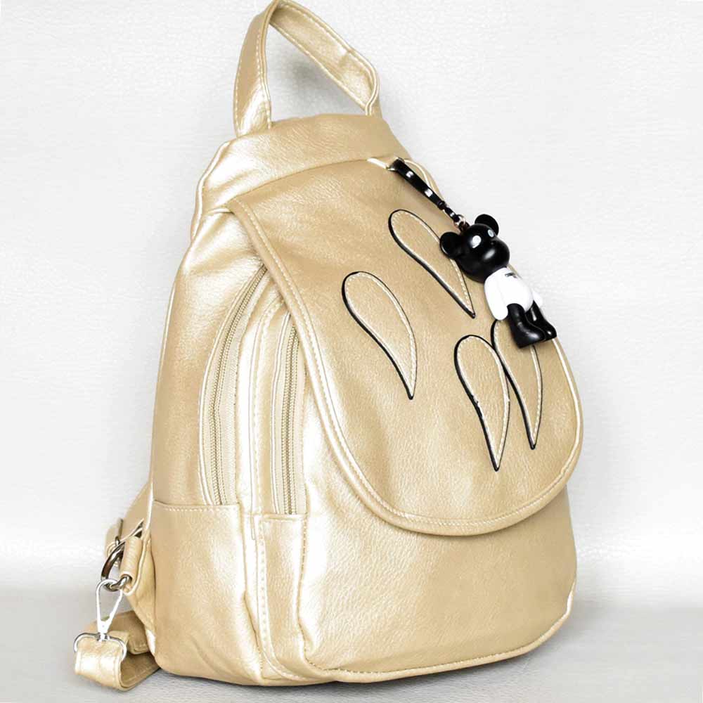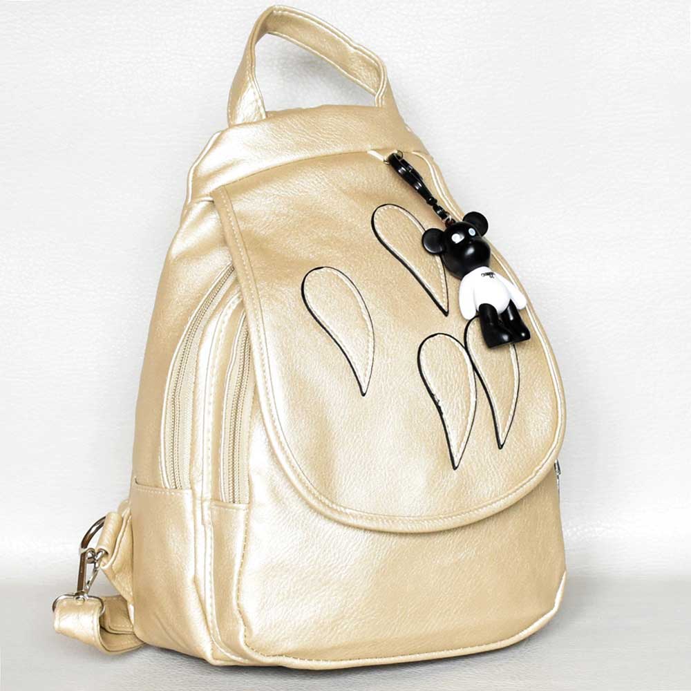 Дамска раница от еко кожа с висулка мече и капак с листенца, златистаДамска раница от еко кожа с висулка мече и капак с листенца, златистаdsc_0014_1514829431