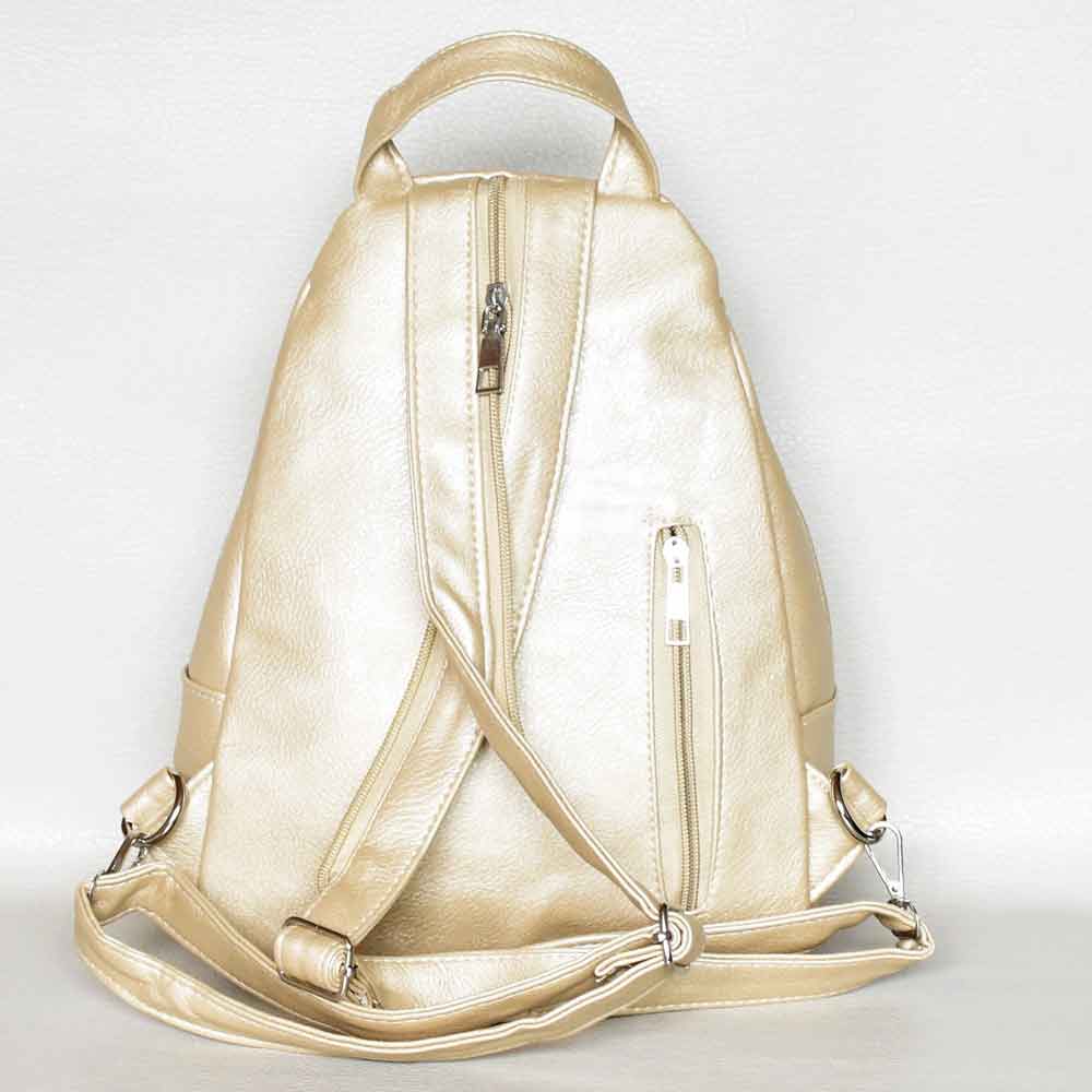 Дамска раница с висулка и капак с листенца, една голяма преграда с вътрешен джоб с цип и джоб за телефон, преден и заден джоб с цип, презрамки с цип за удобно носене на рамо. Цвят-злато.