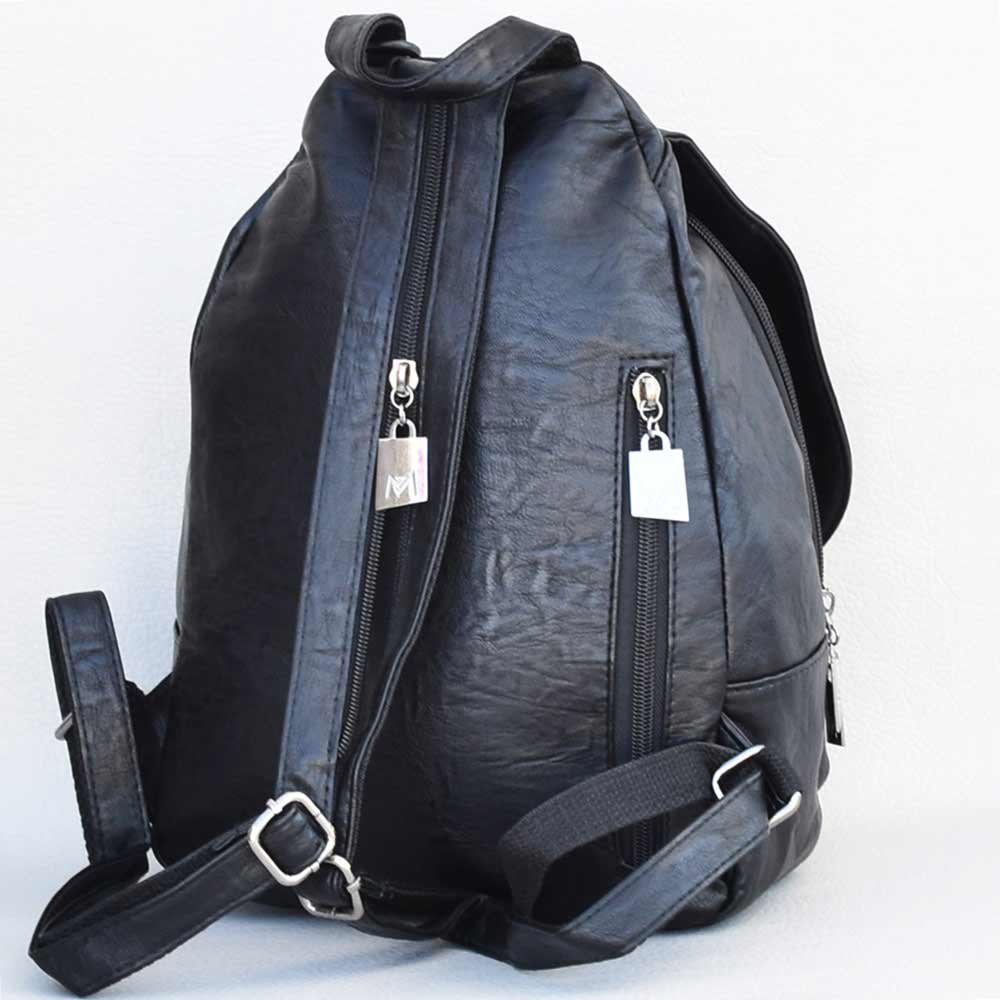 Елегантна дамска раница от висококачествена еко кожа, капак с магнитно копче, капси и декоративен цип, едно основно отделение, преден и заден джоб с цип, малко предно джобче, вътрешен джоб с цип и два джоба за телефон.
