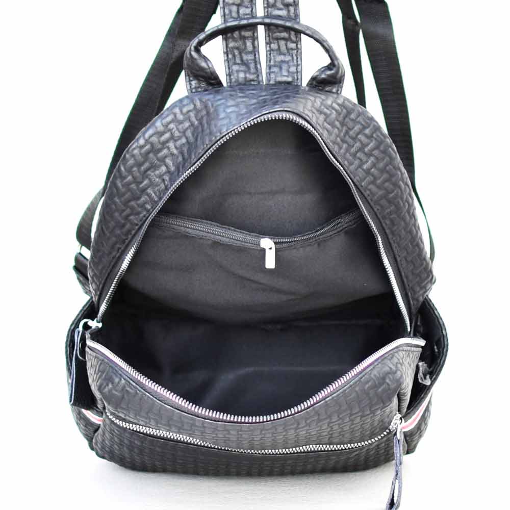 Ефектна дамска раница от релефна еко кожа с едно основно отделение с удобно вътрешно разпределение, преден и заден джоб с цип и две странични джобчета. Дамската раница е с регулиращи се презрамки и дръжка за носене в ръка.