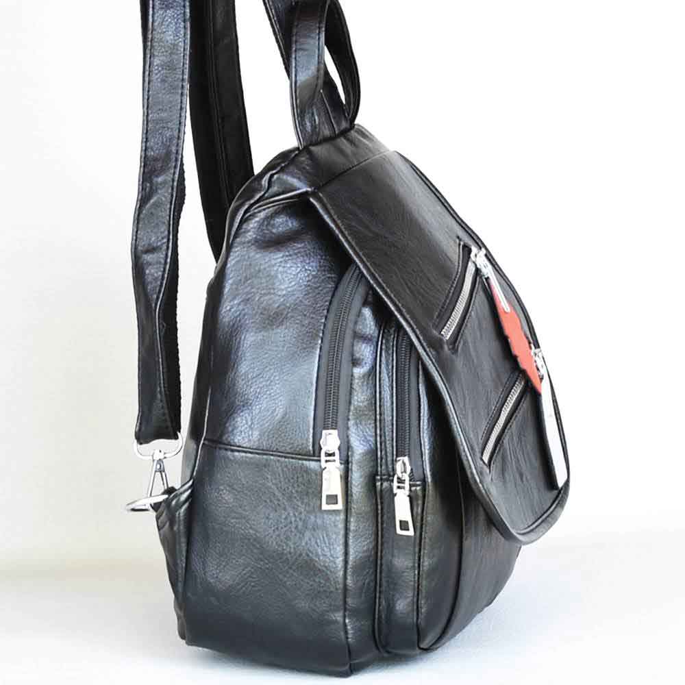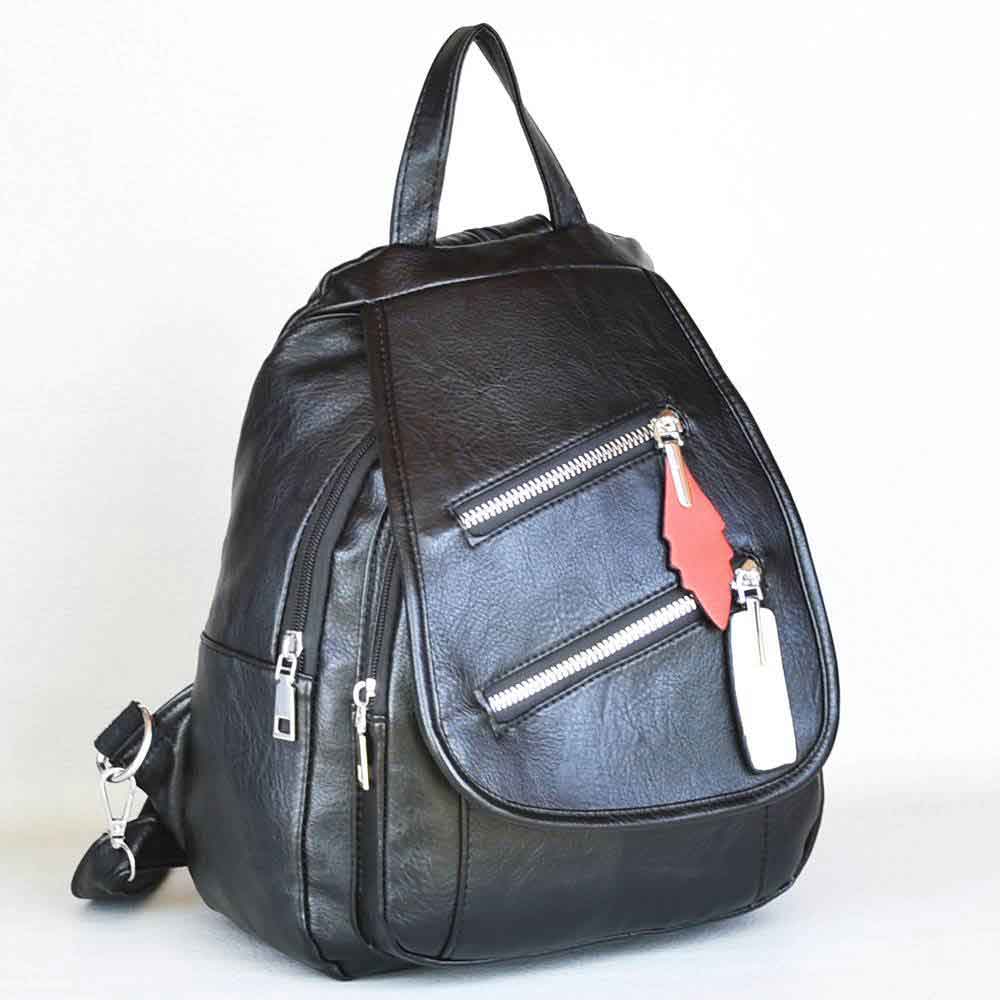 Дамска раница от мека варена еко кожа с капак с декоративни ципове, черна Код EK8817