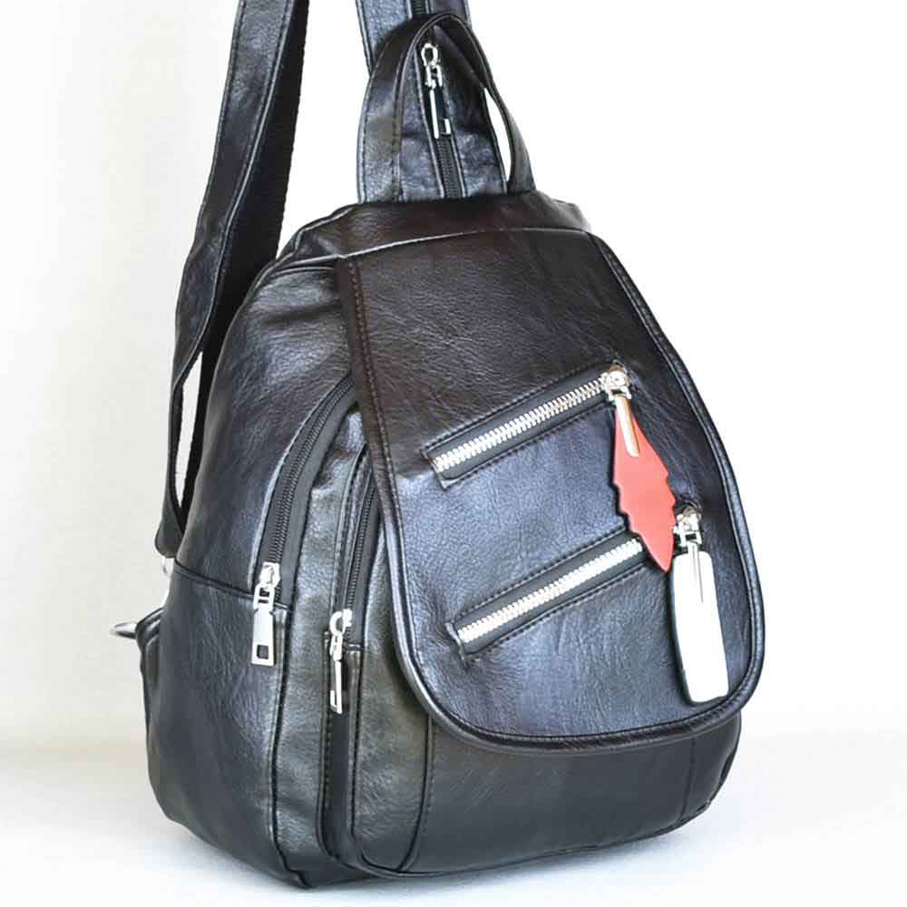 Дамска раница с капак с декоративни ципове и ефектни висулки на циповете, една голяма преграда с вътрешен джоб с цип и два джоба за телефон, преден и заден джоб с цип, джобче под капака. Дамската раница е с регулиращи се презрамки с цип за удобно носене на рамо и къса дръжка за носене в ръка.