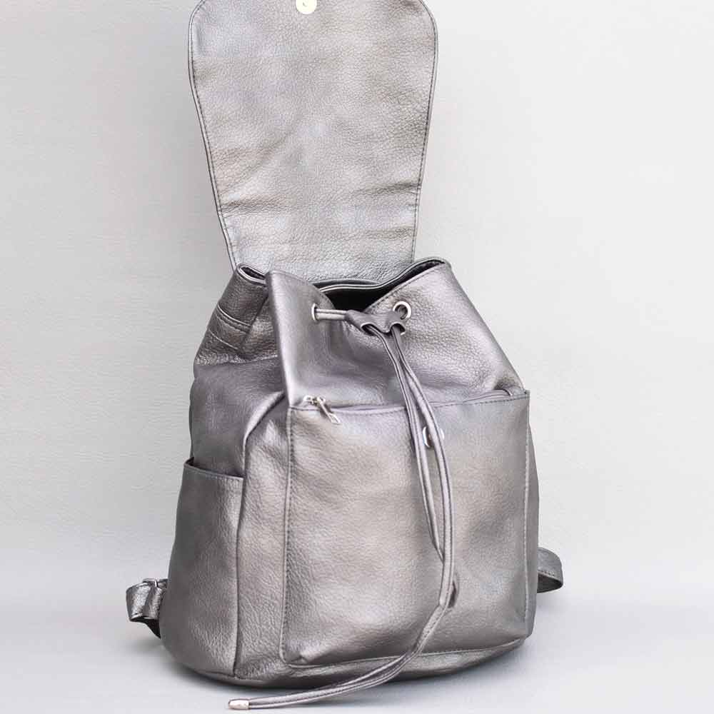 Дамска кожена раница с капак, текстилен хастар с вътрешен джоб с цип и джоб за телефон, преден и заден джоб с цип и две странични джобчета. Дамската раница е с къса дръжка за носене в ръка и регулиращи се презрамки.
