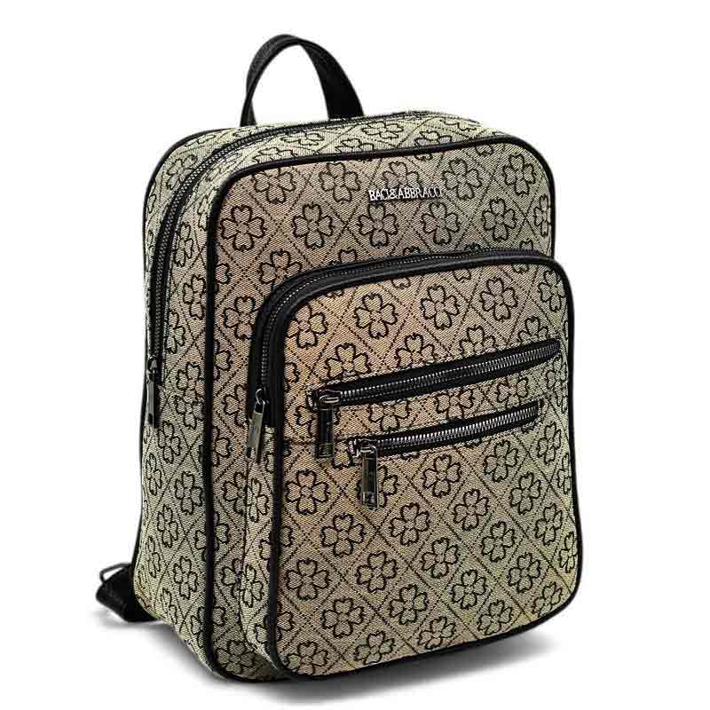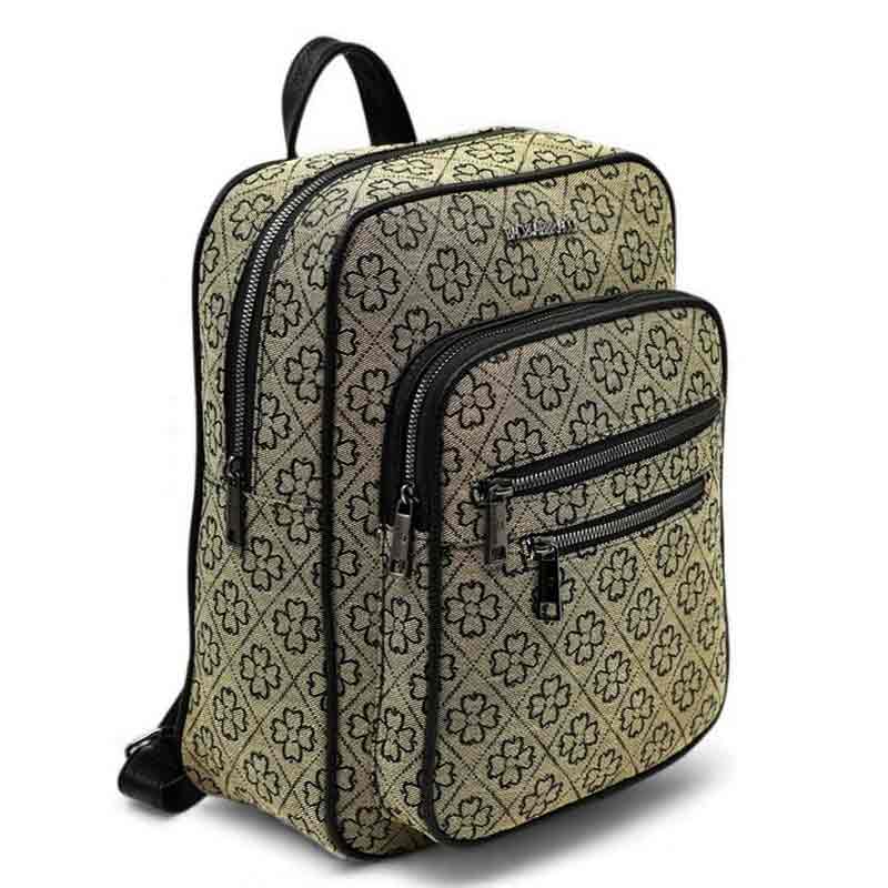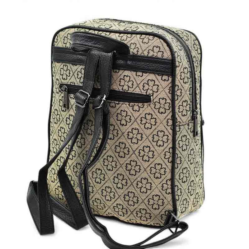 Дамска текстилна раница с едно основни отделение, три предни и един заден джоб с цип. Дамската раница има удобна дръжка за носене в ръка и регулиращи се кожени презрамки.