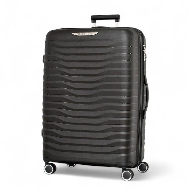 Твърд куфар от полипропилен с разширителен цип 5 см, четири двойни колелца, въртящи се нa 360 градуса, четири крачета, двустепенна телескопична дръжка, дръжки за вертикално и хоризонтално носене. Куфарът е с две отделения за дрехи с цип и с ластични презрамки и джоб за аксесоари.