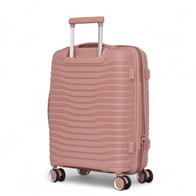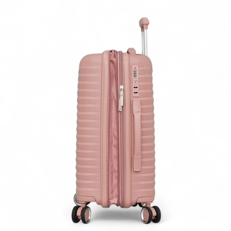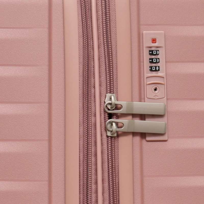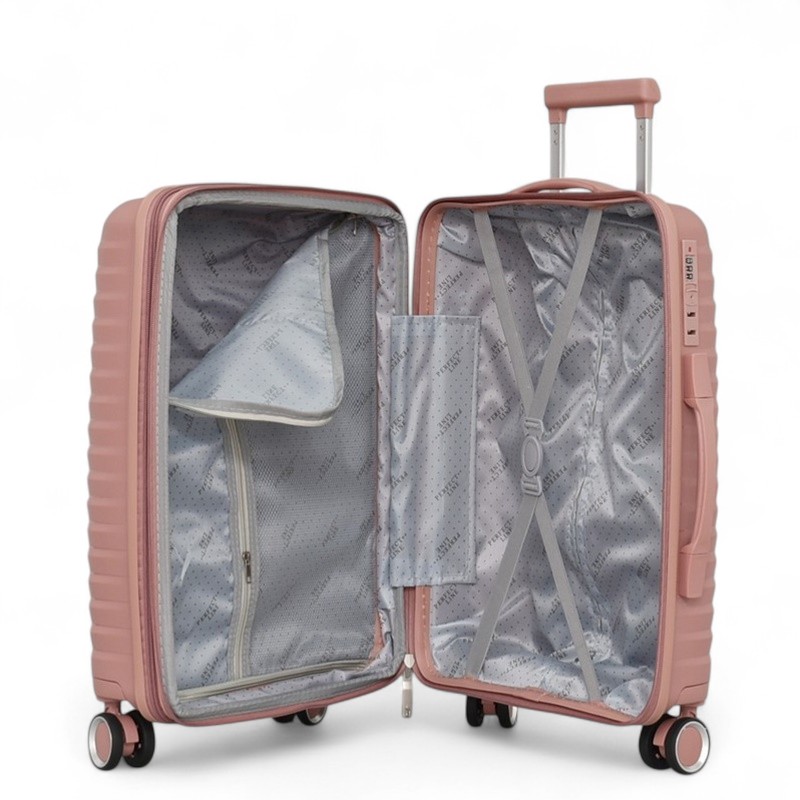 Твърд куфар от полипропилен с разширителен цип 5 см, четири двойни колелца, въртящи се нa 360 градуса, четири крачета, двустепенна телескопична дръжка, дръжки за вертикално и хоризонтално носене. Куфарът е с две отделения за дрехи с цип и с ластични презрамки и джоб за аксесоари.
