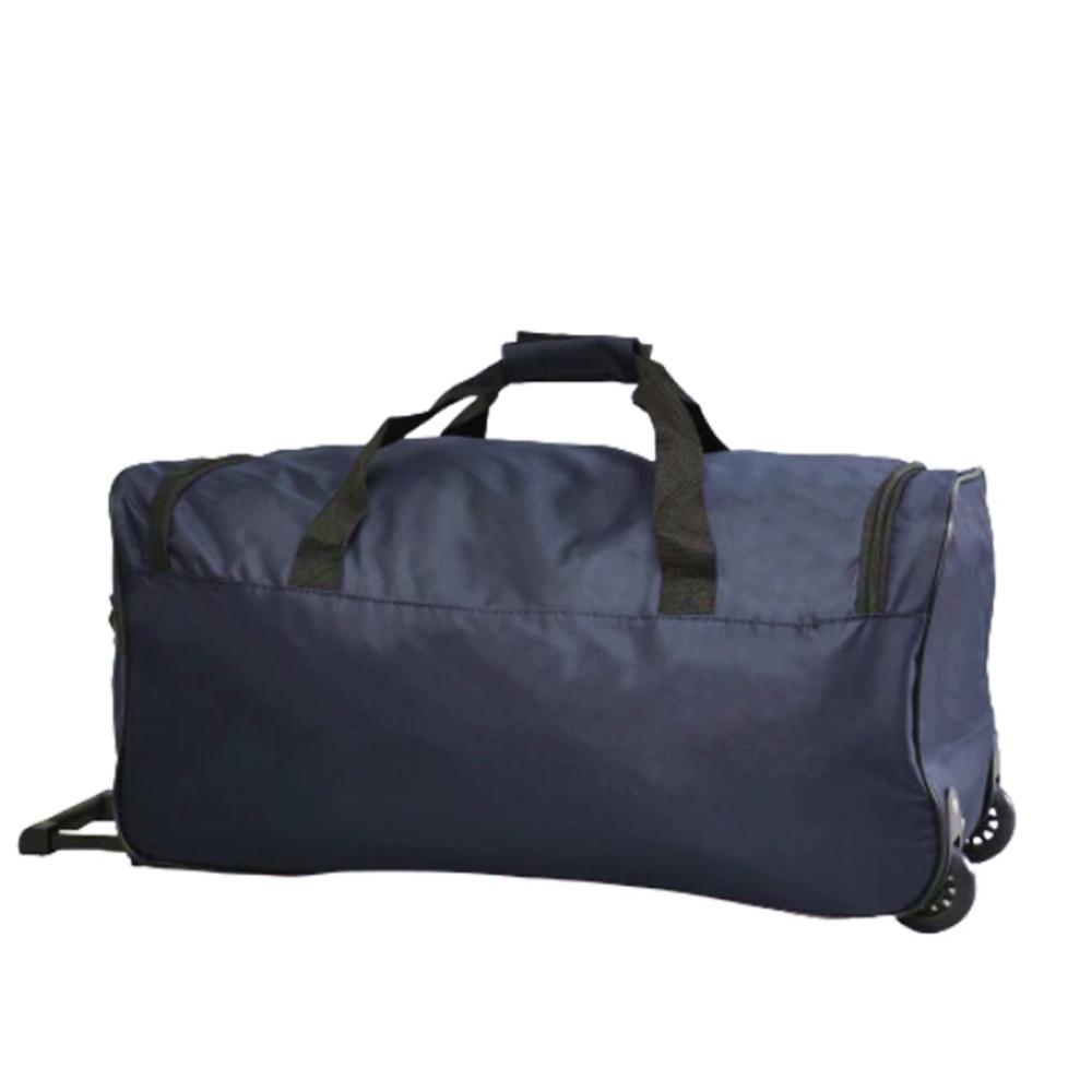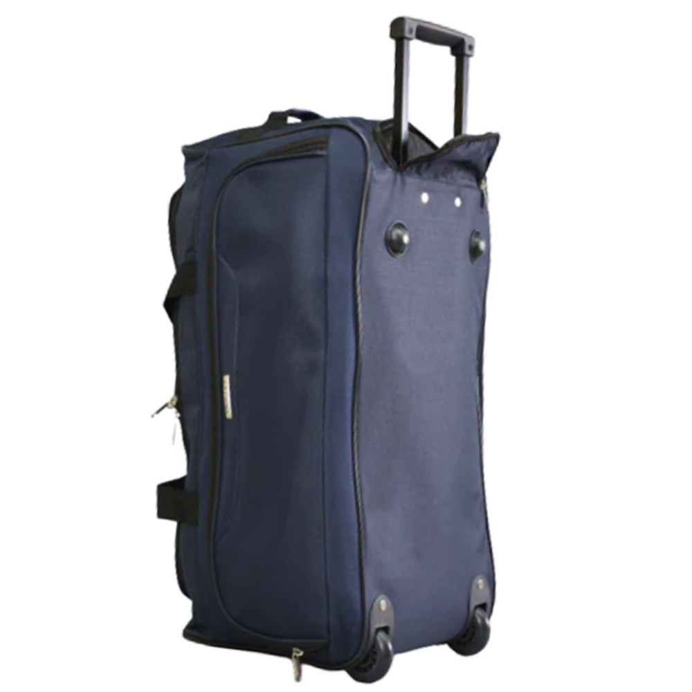 Сак с две колелца от здрав непромокаем плат, къси дръжки за носене в ръка, телескопична дръжка и две крачета отдолу. Пътната чанта е с едно основно отделение и голям преден джоб.