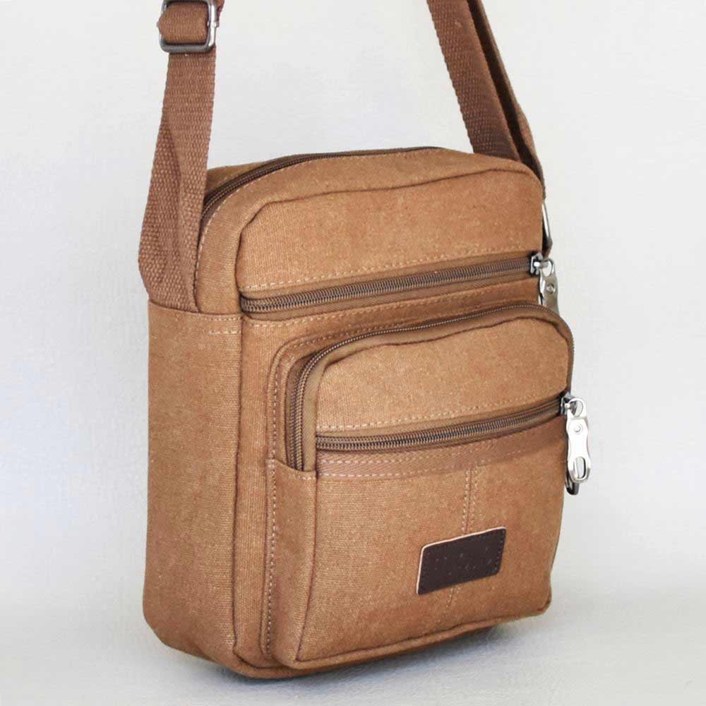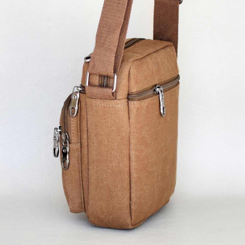 Мъжка чанта от брезент с дълга дръжка за през рамо, едно основно отделение с вътрешен джоб с цип, голям джоб с цип на гърба и три джоба с цип отпред, цвят-бежова.