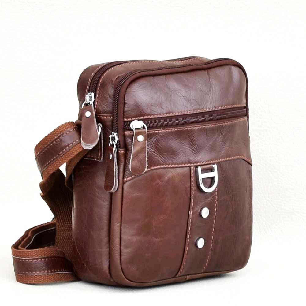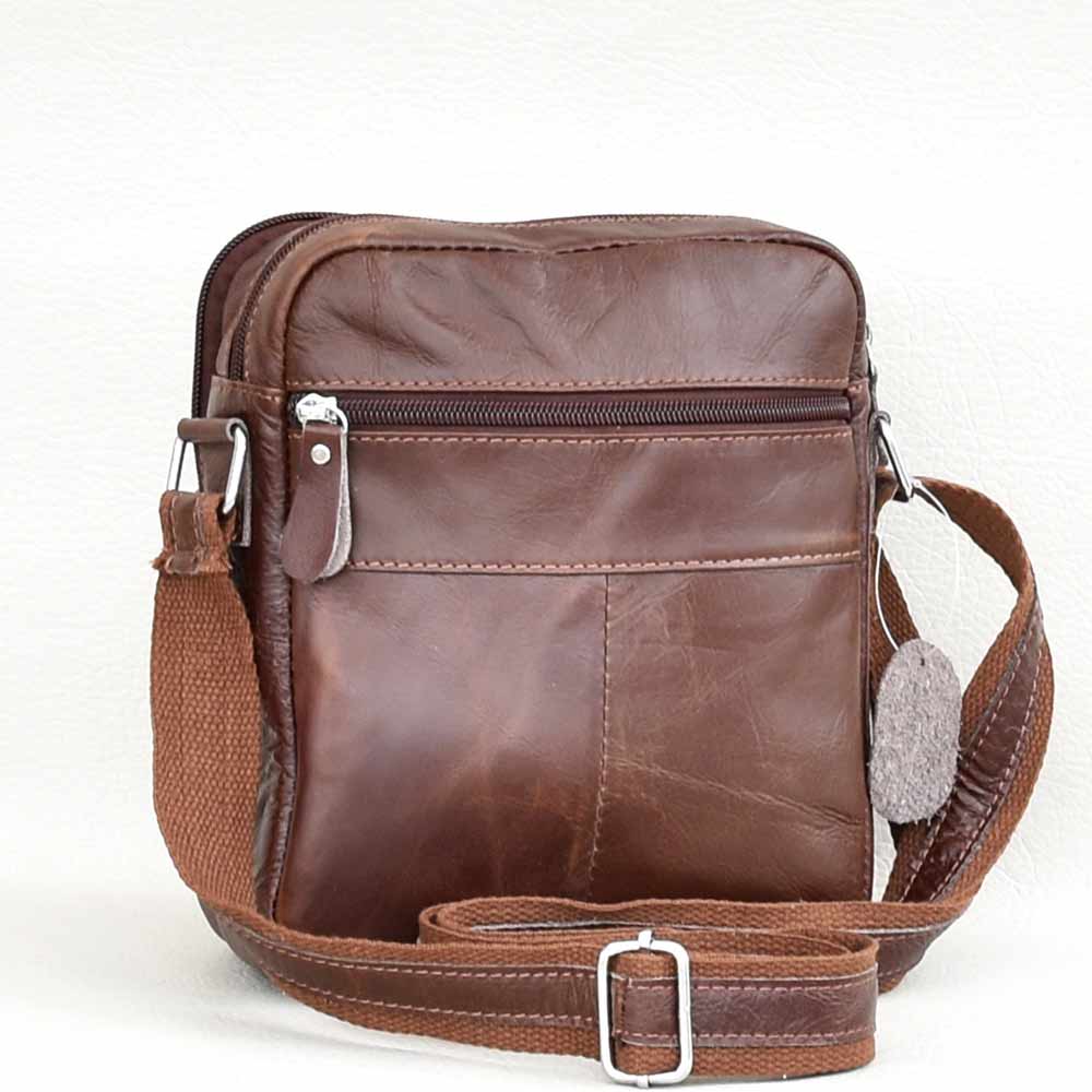 Мъжка чанта от естествена кожа с дълга дръжка за през рамо, с опция за носене  хоризонтално или вертикално, две основни отделения, един преден и един заден джоб с цип, вътрешен джоб с цип.