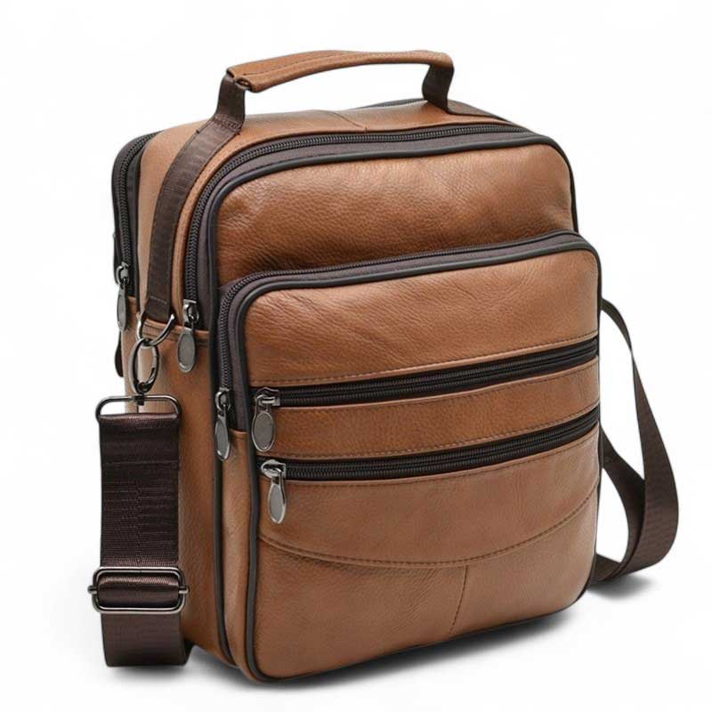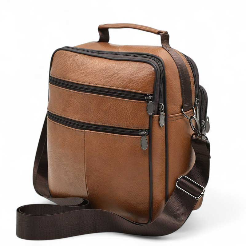 Мъжка чанта от естествена кожа с много джобчета височина 24 см изчистен модел светло кафява Код GL-6253-2