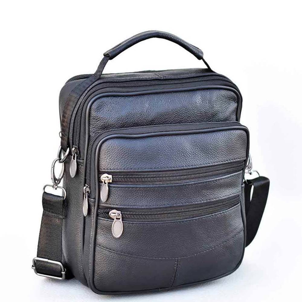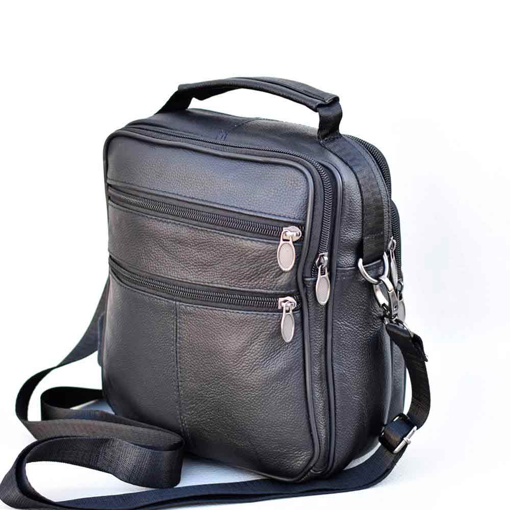 Практична мъжка чанта от естествена кожа, с къса дръжка за носене в ръка и дълга дръжка за през рамо. Мъжката чанта е с две големи отделения, едното с вътрешен джоб с цип, три предни и два задни джоба с цип.