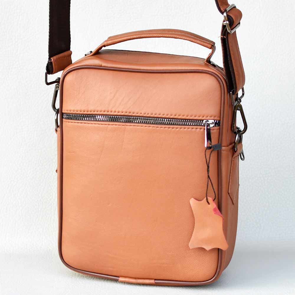 Мъжка чанта от естествена кожа, височина 25 см, с къса и дълга дръжка, светло кафява Код H3124-2
