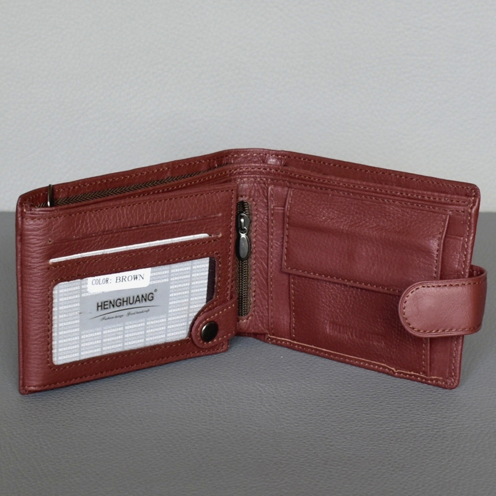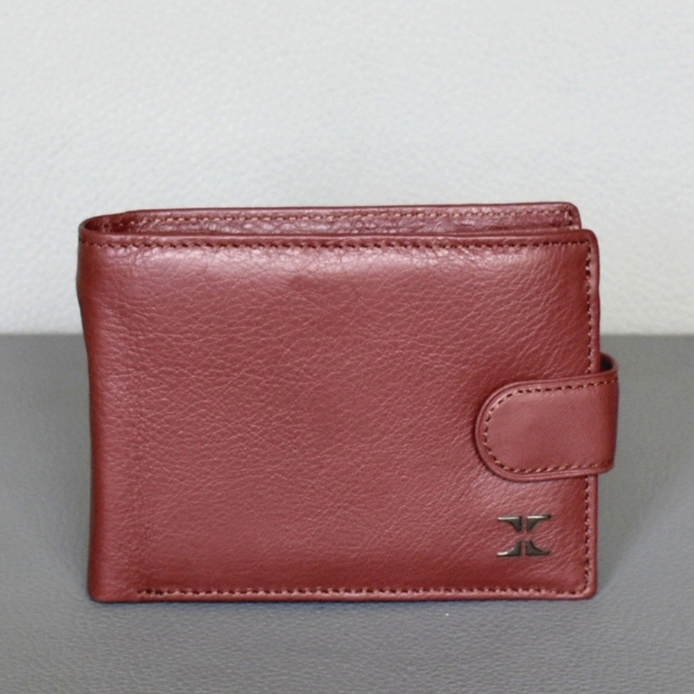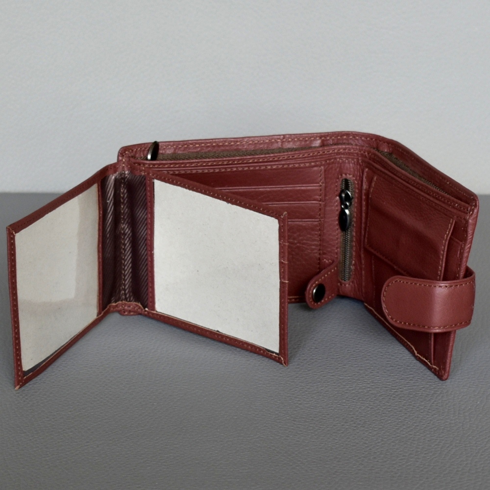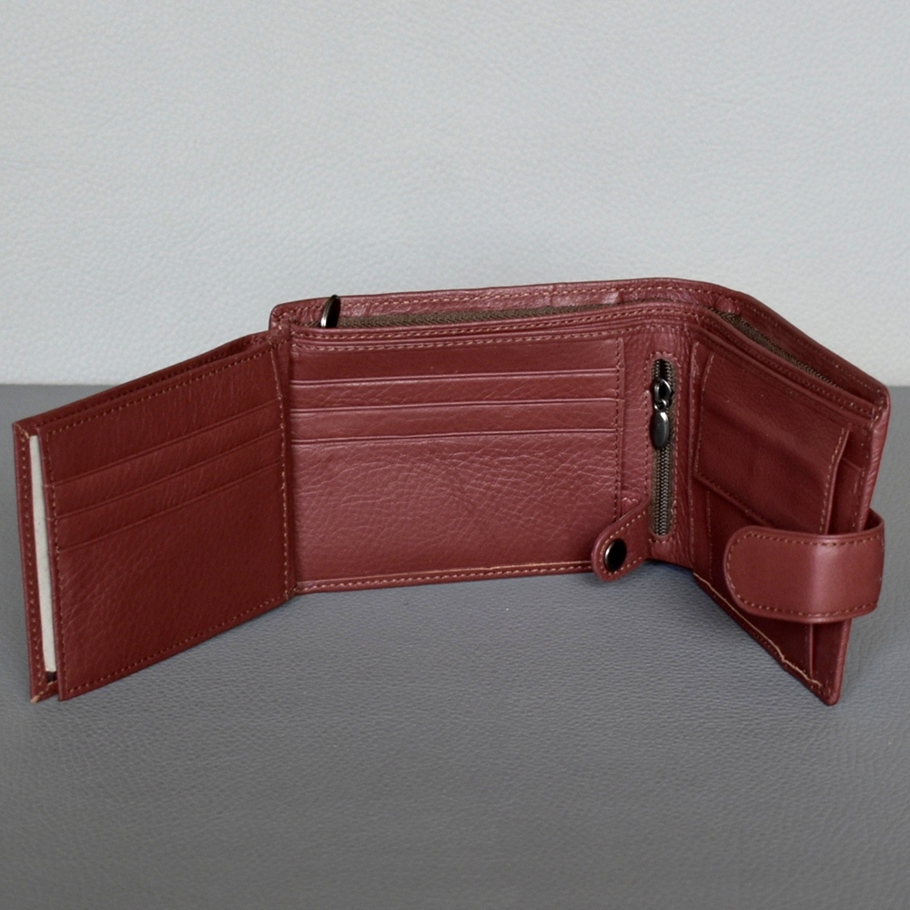 Класически мъжки портфейл с монетник и три отделения за банкноти,едното с цип.Цвят-тъмно червен.