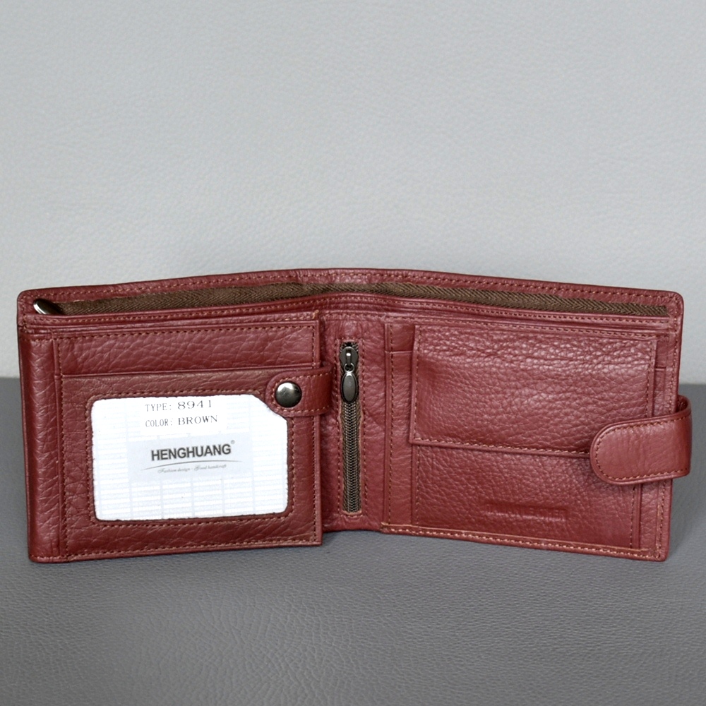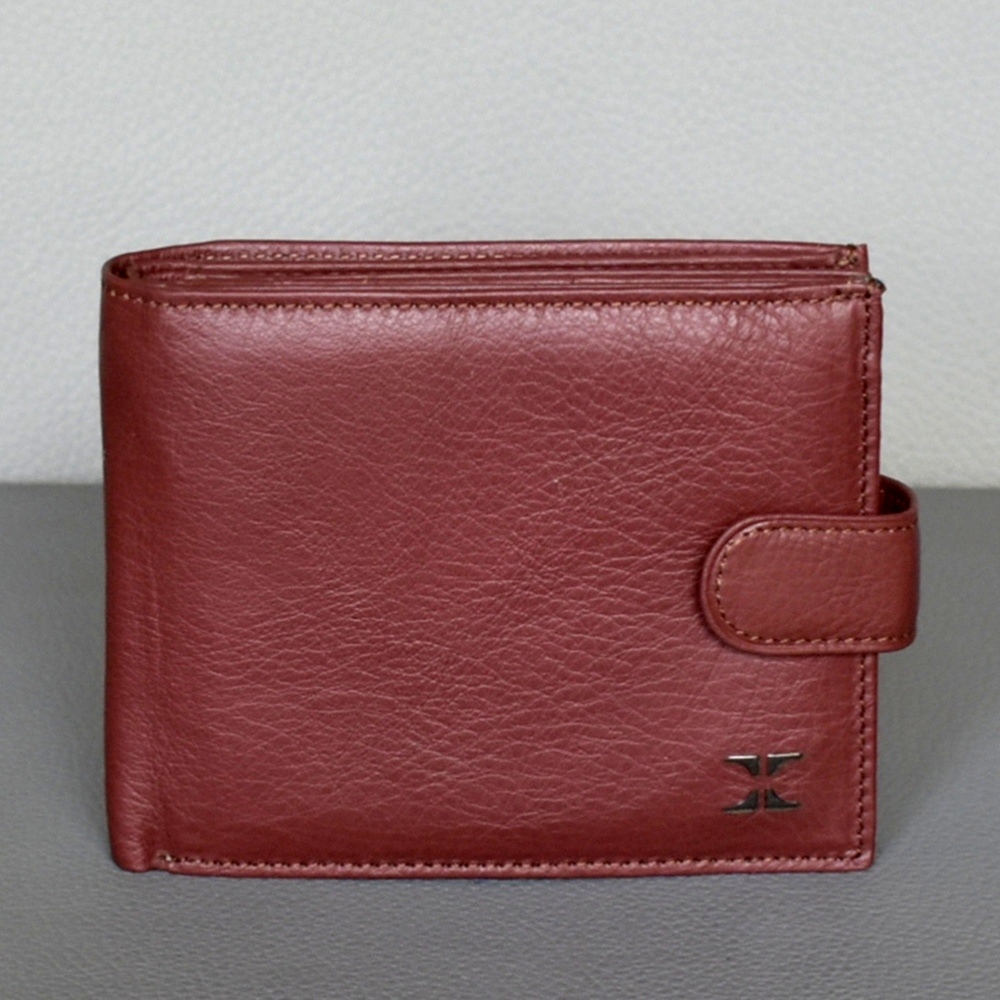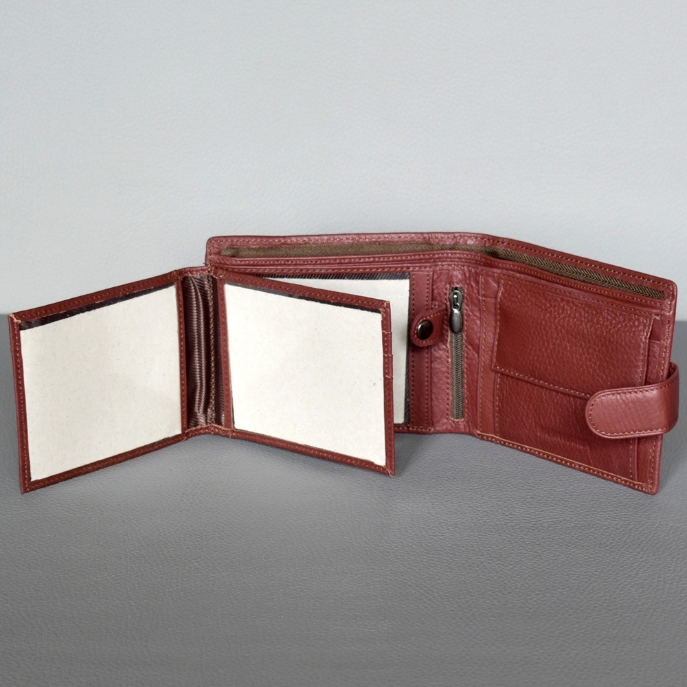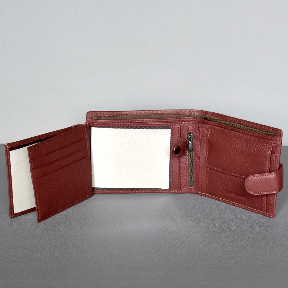 Класически мъжки портфейл с монетник и три отделения за банкноти,едното с цип.Цвят-тъмно червен.