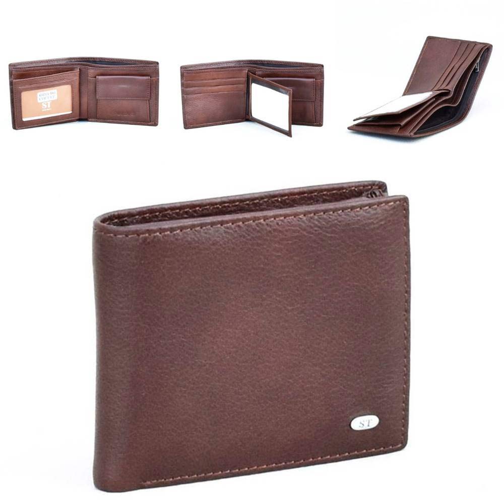 Класически модел мъжки портфейл от естествена кожа, хоризантален, без закопчаване, страничка с джобчета да карти, документи или снимки, вътрешен монетник с тик-так копче, три отделения за банкноти, едното с цип. Портмонето ще получите в луксозна кутия, подходяща за подарък.
