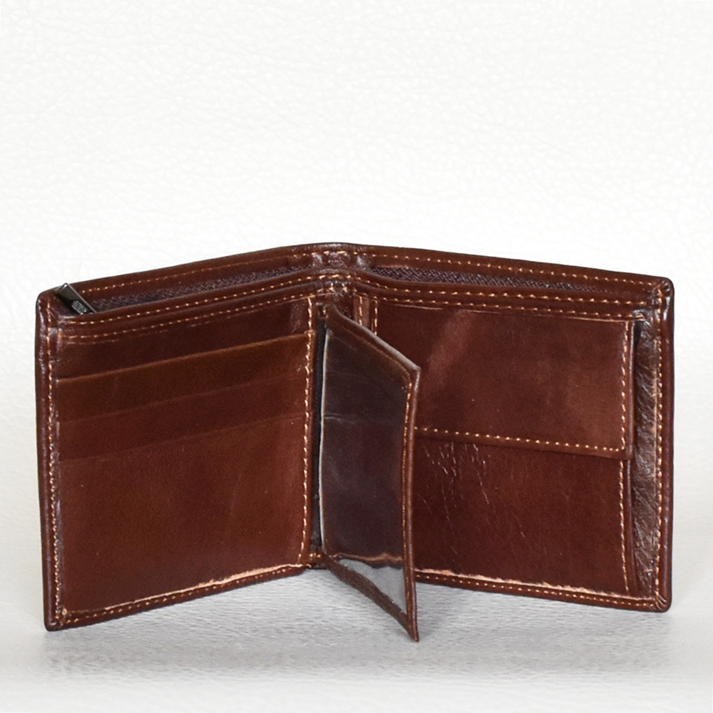 Кафяв портфейл от естествена кожа без закопчаване, с монетник и допълнителна страница за карти и документи.