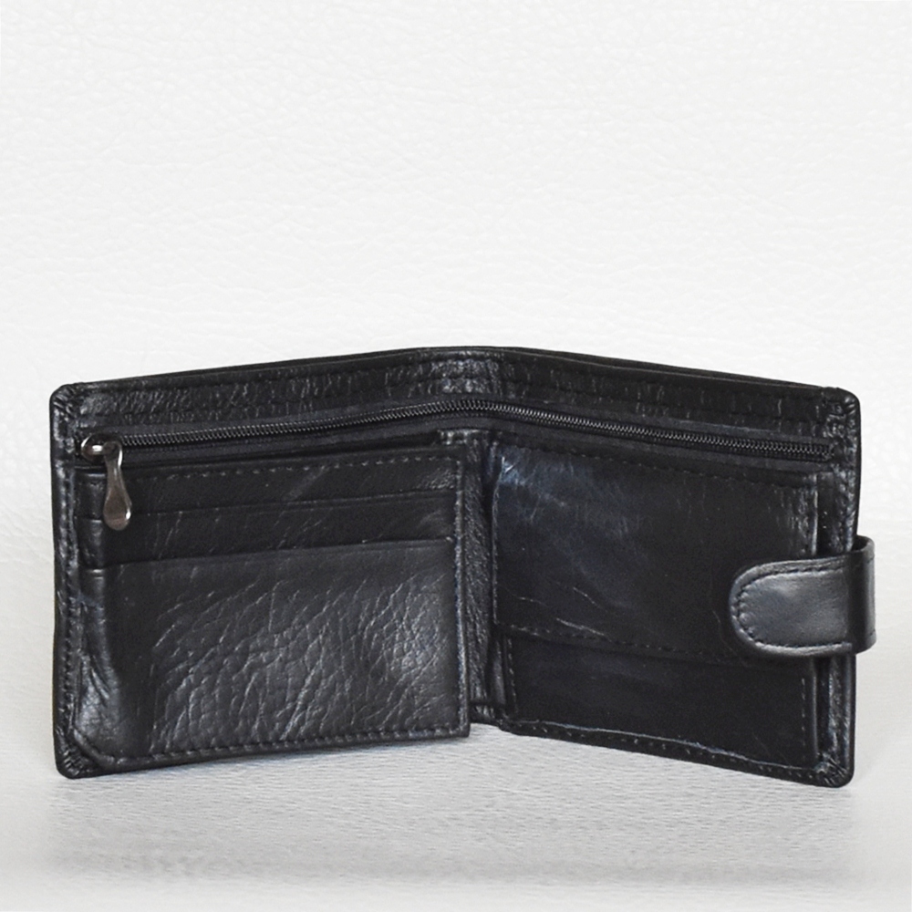 Малък черен мъжки портфейл от естествена кожа с монетник и закопчаване, монетник и страничка за документи.